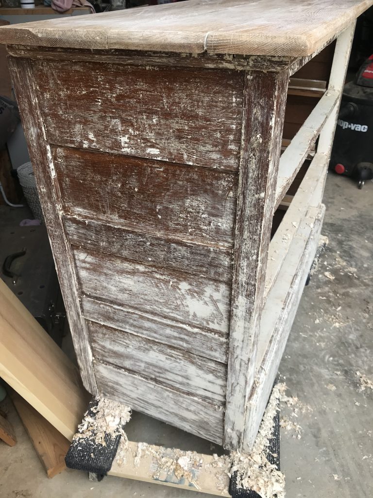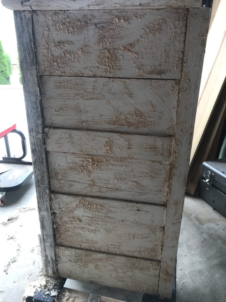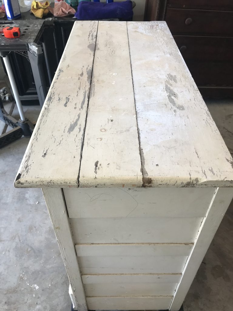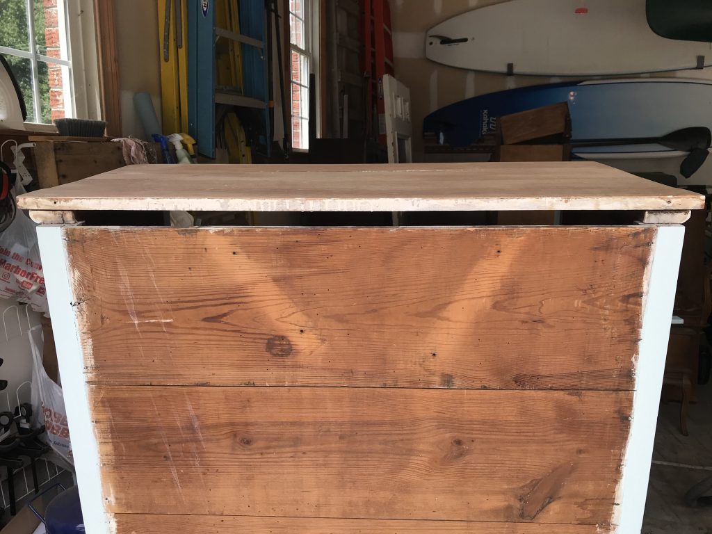 Once the paint was gone, I turned to the repairs that this old piece needed. For one, the top had dark water stains in the wood. I planned on leaving the top natural wood, so these needed to be removed.