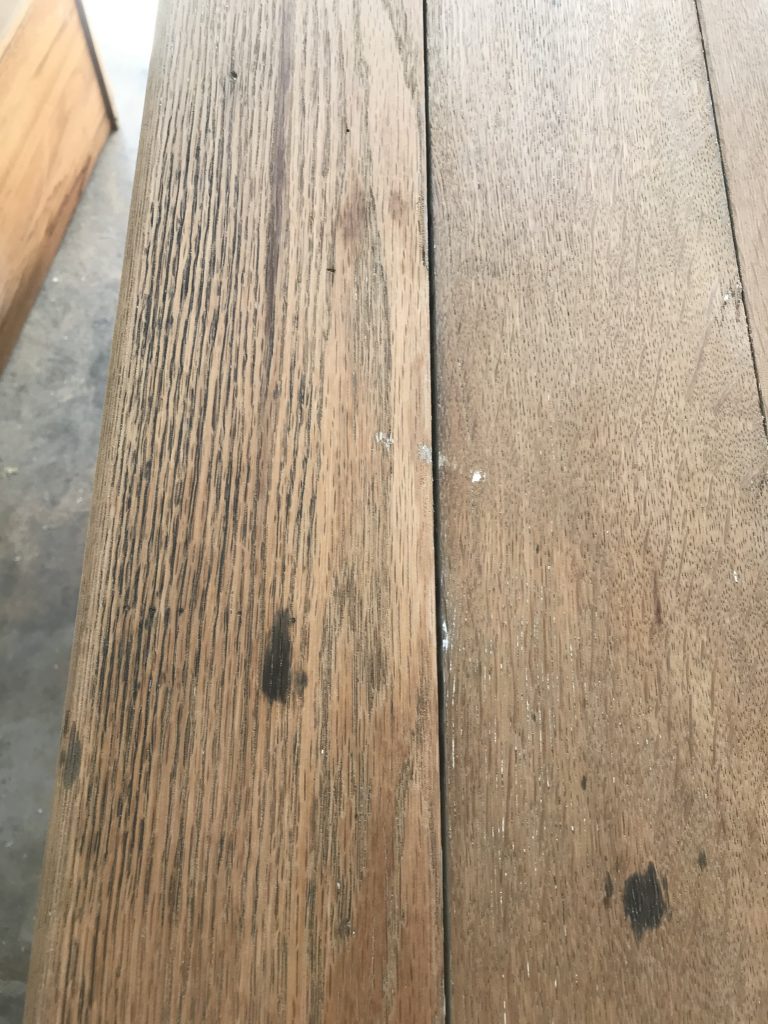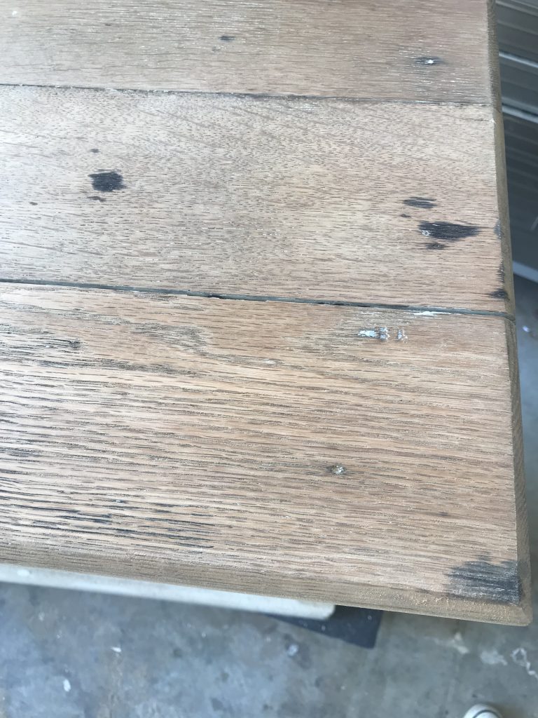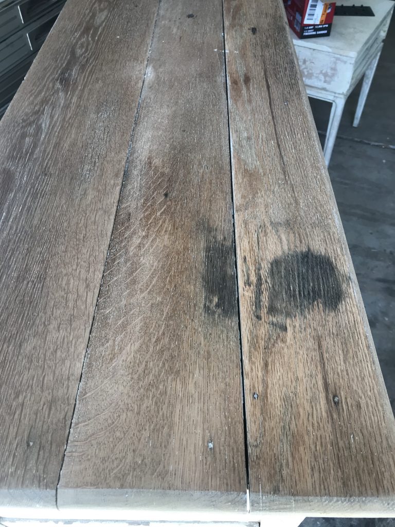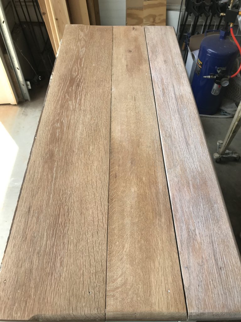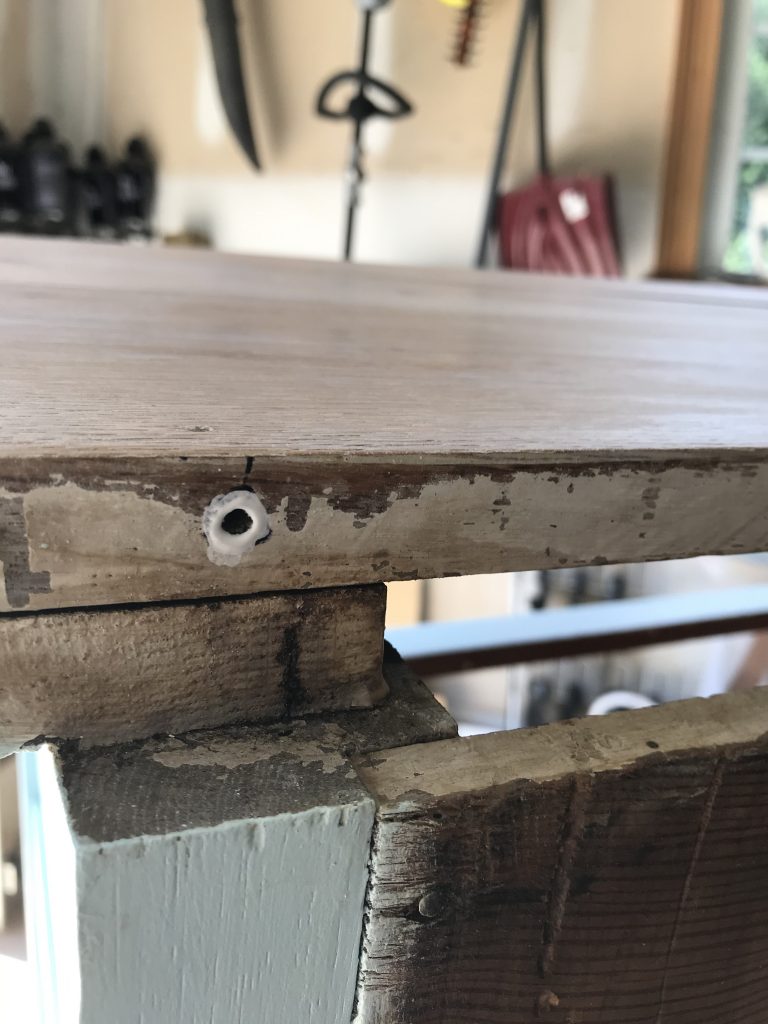 Once the paint was gone, I turned to the repairs that this old piece needed. For one, the top had dark water stains in the wood. I planned on leaving the top natural wood, so these needed to be removed.