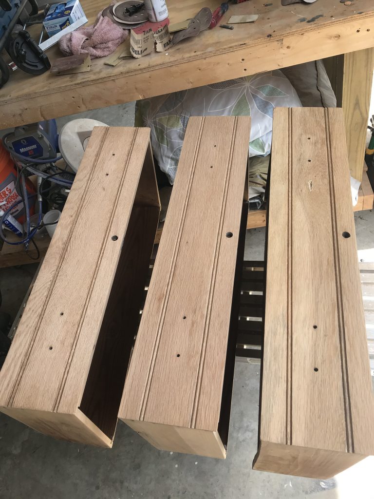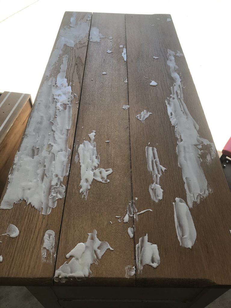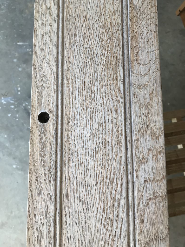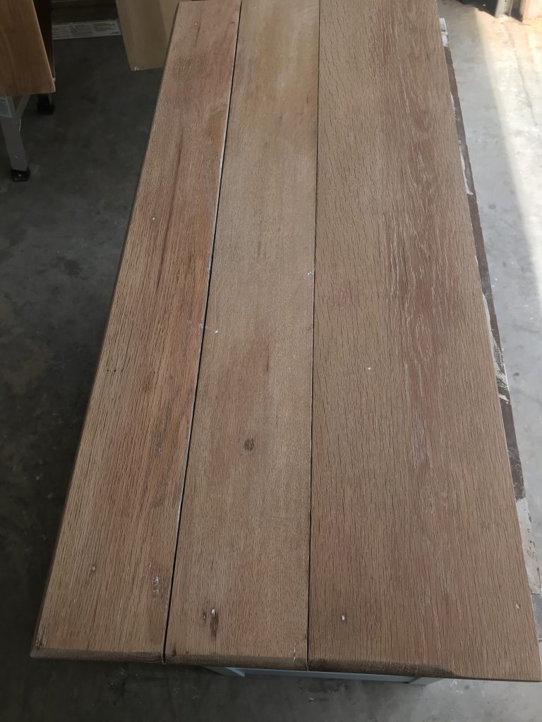 In order to make them match, I applied a whitewash to both. This is simply very watered down white paint applied with a brush (Angled 2 inch Stubby https://bit.ly/3oI0V9z) and removed with a wet rag until you get the look you want. You can see the difference the white wash makes in changing the tone of the wood while still showing the grain.