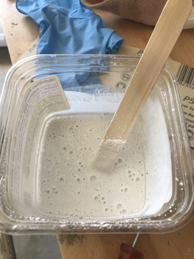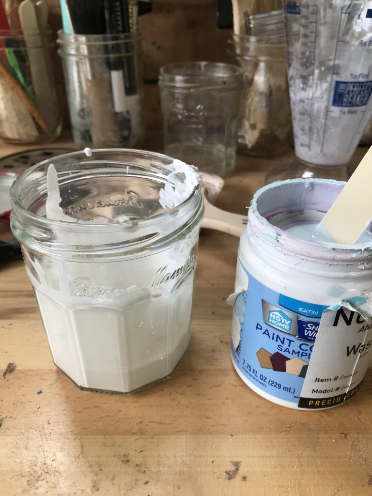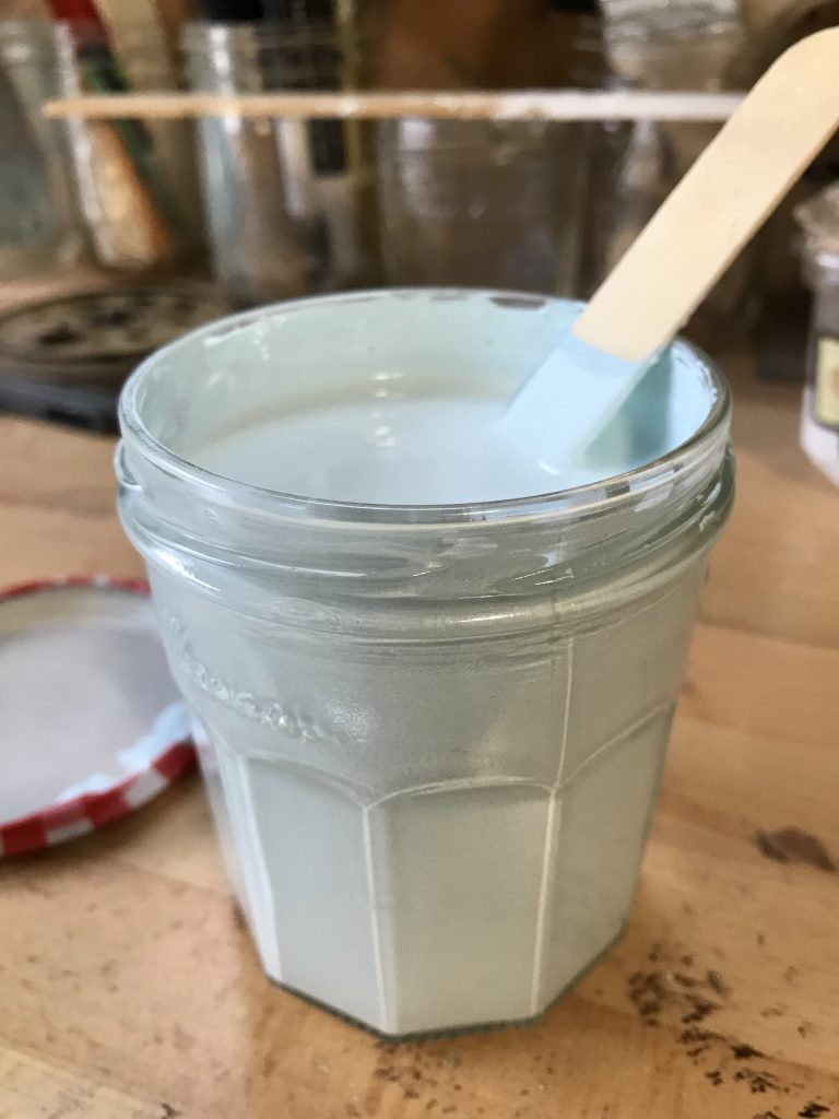 Finally all the repairs were completed and it was time to paint. I primed the body of the piece with my tried and true BIN Shellac Primer, Quart https://amzn.to/3g8fuyb. It took two coats, applied with a throw away chip brush 3 inch, 24 pack https://amzn.to/2WNntJf. I made a chalk paint out of an oops paint that I had on hand. I’ve talked about how to make your own chalk paint before, but basically it’s two parts paint to one part calcium carbonate – Calcium Carbonate https://amzn.to/3ia8lyt.