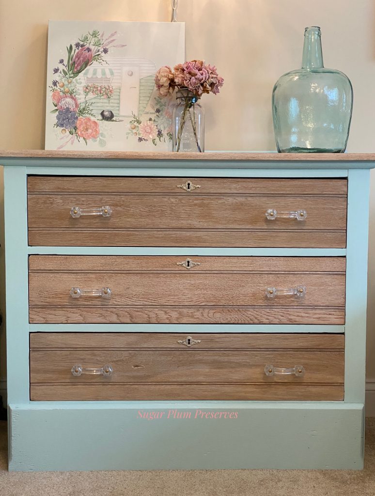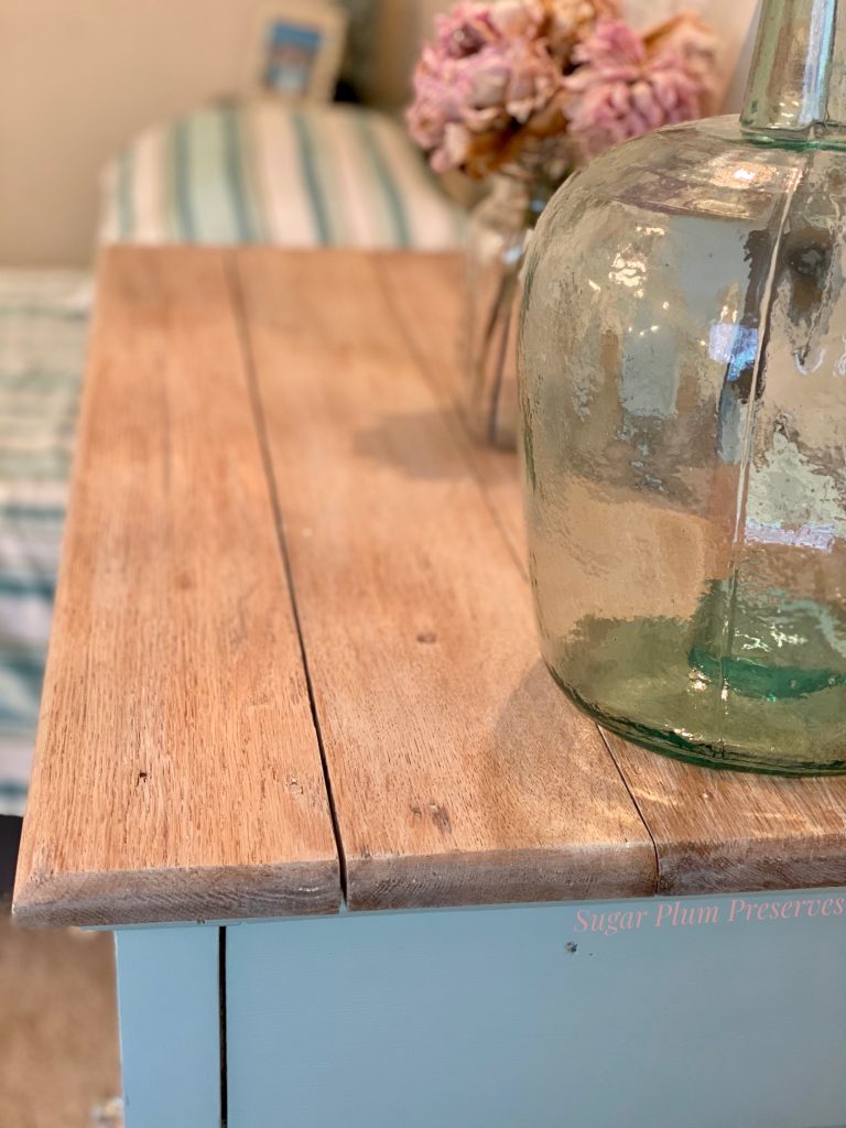Can you believe that this was an “oops” paint?? The color is so delicious, I want to lick it! 😋 I had been dying to use this color and the rustic nature of the chest made it the perfect style for a driftwood, beachy transformation. The body got three coats of paint with my favorite paint brush, Round 1 inch https://bit.ly/3oI0V9z. Next, I turned my attention to creating the driftwood look on the top and drawer fronts. I was successful in removing the dark spots on the top, but the color of the natural wood wasn’t quite light enough. Also, the drawer fronts were made from a different type of wood and were too orange.