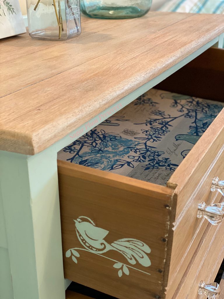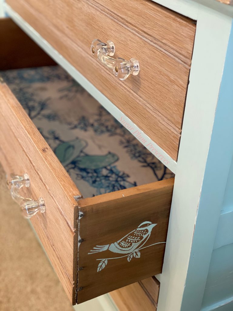 I fell in love with this beautiful fabric that matched perfectly AND had birds!! I used my trick for lining drawers – go to the dollar store and buy foam core board, cut it to size, cut the fabric slightly larger than the board https://amzn.to/2XfFmj2 , and use spray glue https://amzn.to/2TrcDa1 to attach the fabric. The result is a sturdy drawer liner, cut perfectly to size, and is removable if you want to change it up. 😎 The bird fabric was the perfect excuse to stencil birds on the drawer sides, for added interest. I had the stencil on hand and used the same paint that I used on the body. I think it came out so cute! I sealed the whole piece (including the sides of the drawers to protect the stencil) with three coats of Minwax Water Based Polycrylic, Matte https://amzn.to/36h3kys applied with another one of my tricks – a Car Detail Sponge https://amzn.to/2ANgY0K!