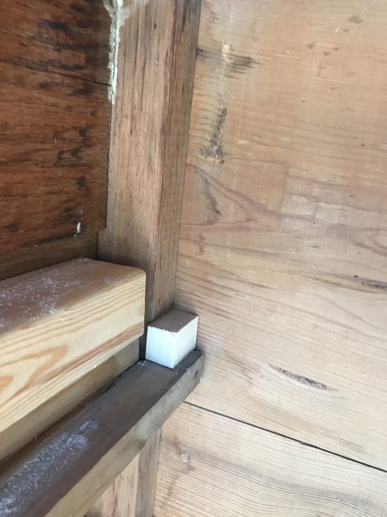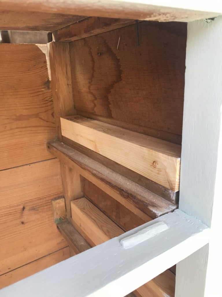 The next issue with the drawers was that they did not slide in and out very easily. As I mentioned, this piece was handmade and quite wonky. The drawers slid around a lot when opening and closing and also did not stop at a uniform depth when closing them. Meaning, they didn’t have appropriate drawer stops in the back and lacked drawer guides to allow them to slide in and out smoothly. I remedied this by measuring, cutting, and gluing (TiteBond Wood Glue https://amzn.to/2LLxIHP) scrap wood on the sides and back of the chest, so that each drawer would close smoothly, level with the sides.