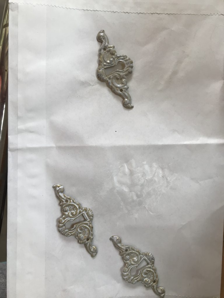I turned my attention to the drawers. They all had keyholes that had been plugged up with a wooden dowel. I wanted to remove the dowels and add some pretty keyhole covers. I got the dowels out by using my drill (Cordless Drill https://amzn.to/2WOBbf2) and a large drill bit to make a large hole in the center of the dowel. I was then able to just chip the remaining wood out. I found some reproduction keyhole covers at an antique mall. The only problem was that they were a very cheap looking gold. I solved this by lightly dry brushing white paint over the top so that the gold looked more worn and pretty.