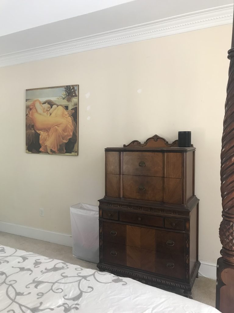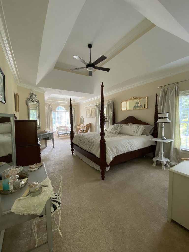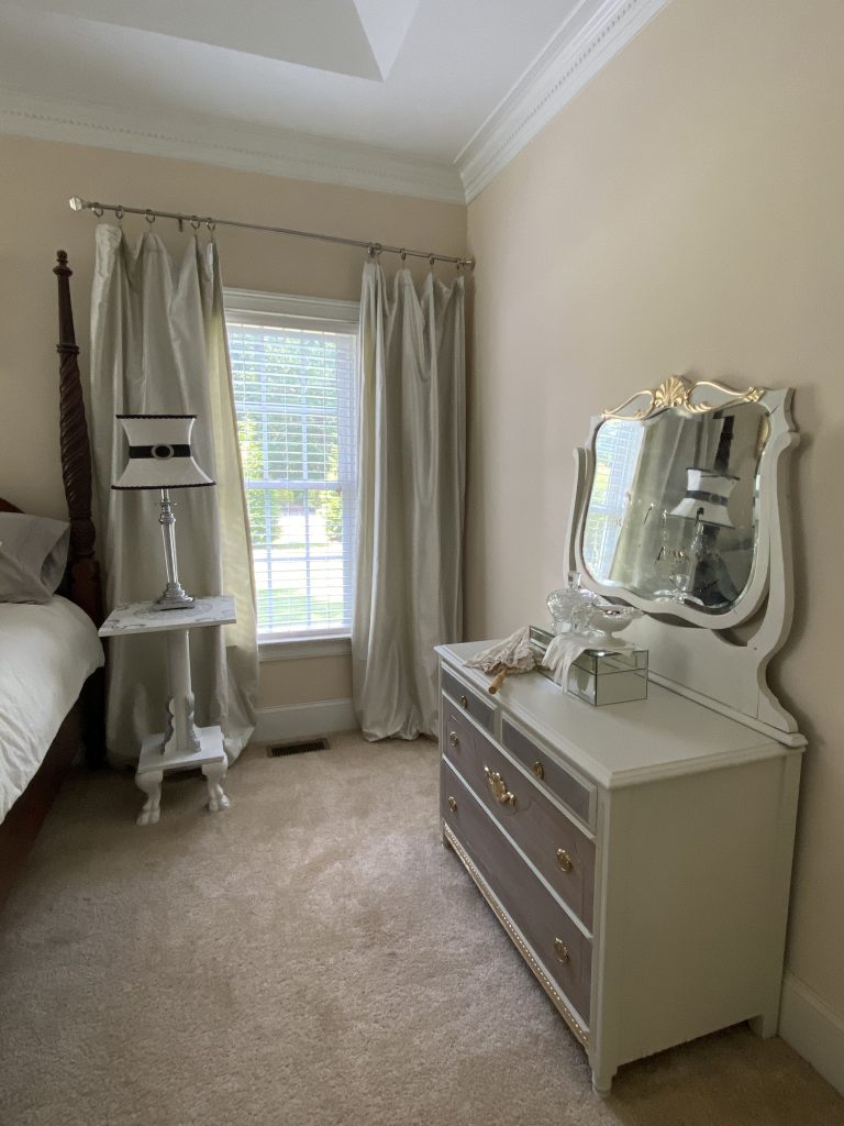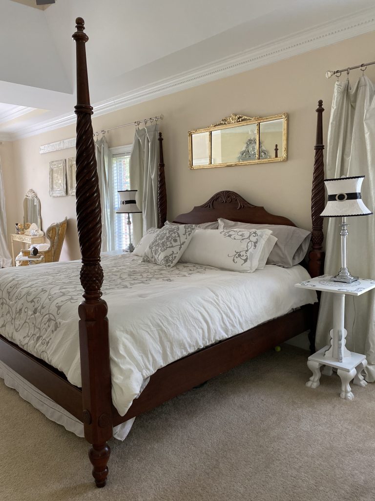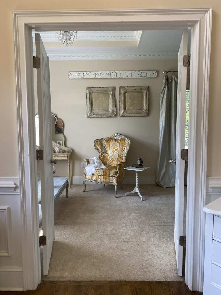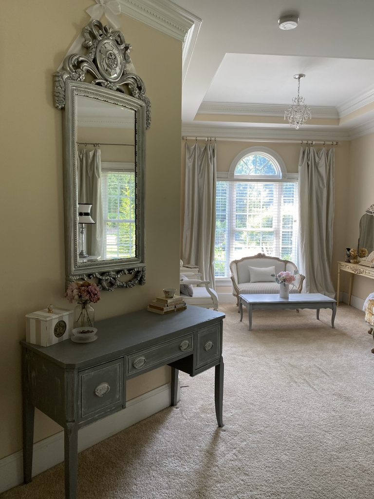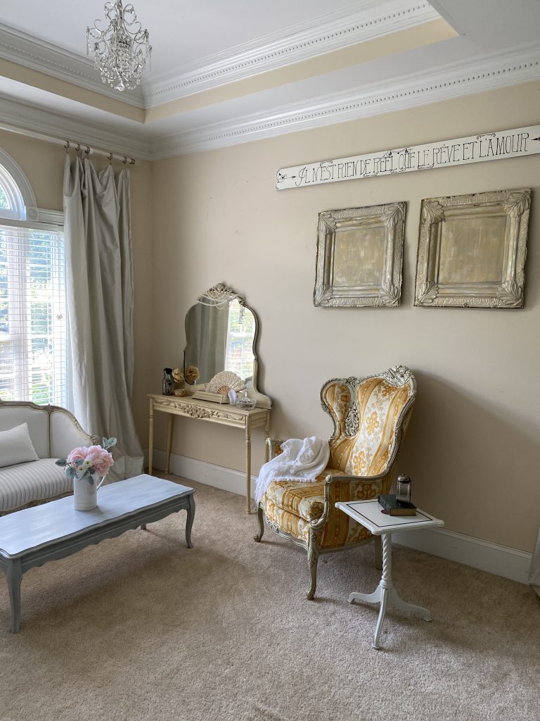 We have finally come to the completed bedroom transformation! My goal was to create a more cohesive, pretty, restful, and intentional space. Our bedroom had a mismatch of furniture pieces and a lack of an intentional style. For some reason, it is the last room to be addressed since we moved in 4 years ago. I don’t know about you, but I can actually “feel” a space. My bedroom was so haphazard, it gave me an underlying sense of anxiety. Definitely not the right feel for a bedroom. I am a “figure it out as I go” kind of person, so any sort of interior design master plan was out the window for me. I painted each piece the way I envisioned how each individual piece should look, with an underlying awareness of the need to match the whole. I think it came together pretty well considering I had a big, well-loved, orange and yellow chair to incorporate. In truth, from a purely aesthetic standpoint, I would have liked to remove it. However, like I said in the Box of Chocolates post, it makes me happy, so I blended it in the best I could. For a complete transformation, I also really would have liked to have painted the walls, but as you can see, it’s a pretty big space and more than I wanted to tackle right now. I really hope you enjoyed the series and the transformations. If you missed any of the posts on the individual pieces included in the “after”, here are the links: