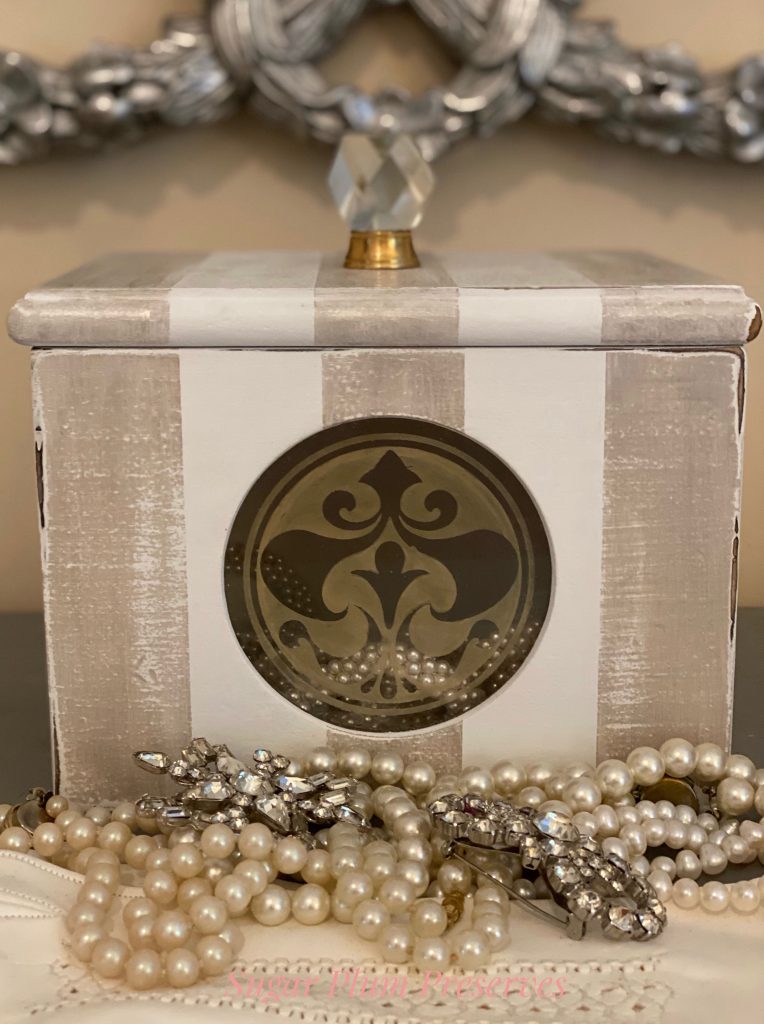 I wasn’t crazy about how perfect the stripes looked. They looked a little too “new” and painted on for me, so I decided to go over the stripes and the corners of the box with 220 grit sandpaper https://amzn.to/3AJZjn8 to give it a distressed look. I replaced the old ugly pull on top with a pretty facetted glass pull to add a little glamour. 💎 I lined the inside of the box and lid with scroll contact paper to give a little pretty surprise when it was opened. 💝
