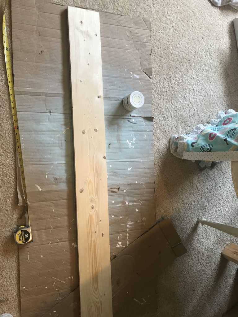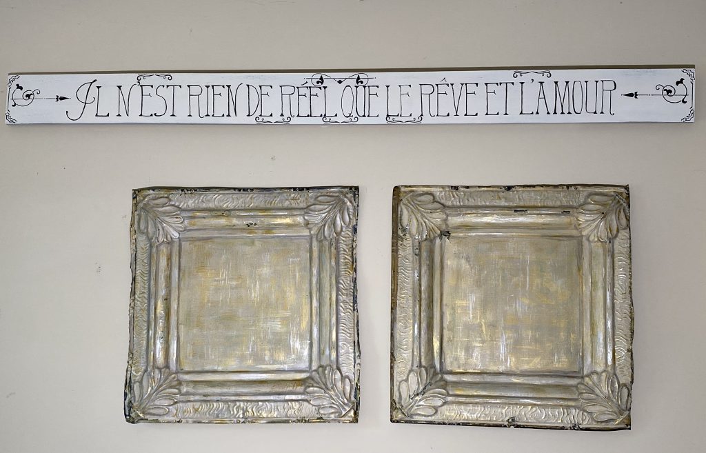 I thought that I would distress the sign once it was painted and wanted a gray color to come through, instead of the wood, so I first painted two coats of Manatee Gray by Dixie Bell. I painted over that with Deco Art Chalk Paint in Lace. I used a few different stencils and a black sharpie to create a design border. I knew that I wanted to write a phrase in French since, if you haven’t figured it out yet, there is a French(ish) theme in the makeover. I wanted the font to reflect an antique French sign. I went online and found a font that I liked, and tried to mimic it the best I could. I used a black sharpie and freehanded the writing. This part was a little challenging, since I wanted the letters fairly equal in size, and I didn’t want to run out of space at the end. I divided the sign and number of letters into fourths and tried to keep each fourth within it’s allotted section. I settled on the phrase “Nothing is real but dreams and love” by Anna de Noailles. I thought it looked pretty in writing and was appropriate for a bedroom. I lightly distressed it so that the gray would come through sparingly. It came out pretty cute (it actually looks better in person, but I couldn’t capture a good photo because of the length) and more importantly, covered up most of those unsightly holes. 💁🏻♀️