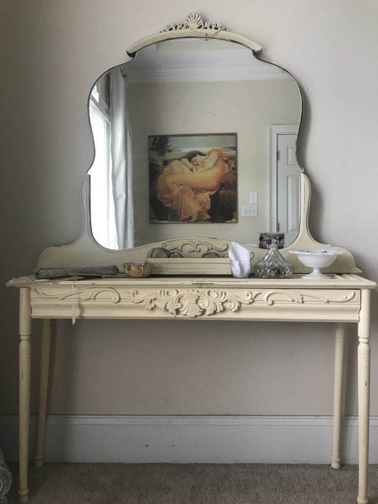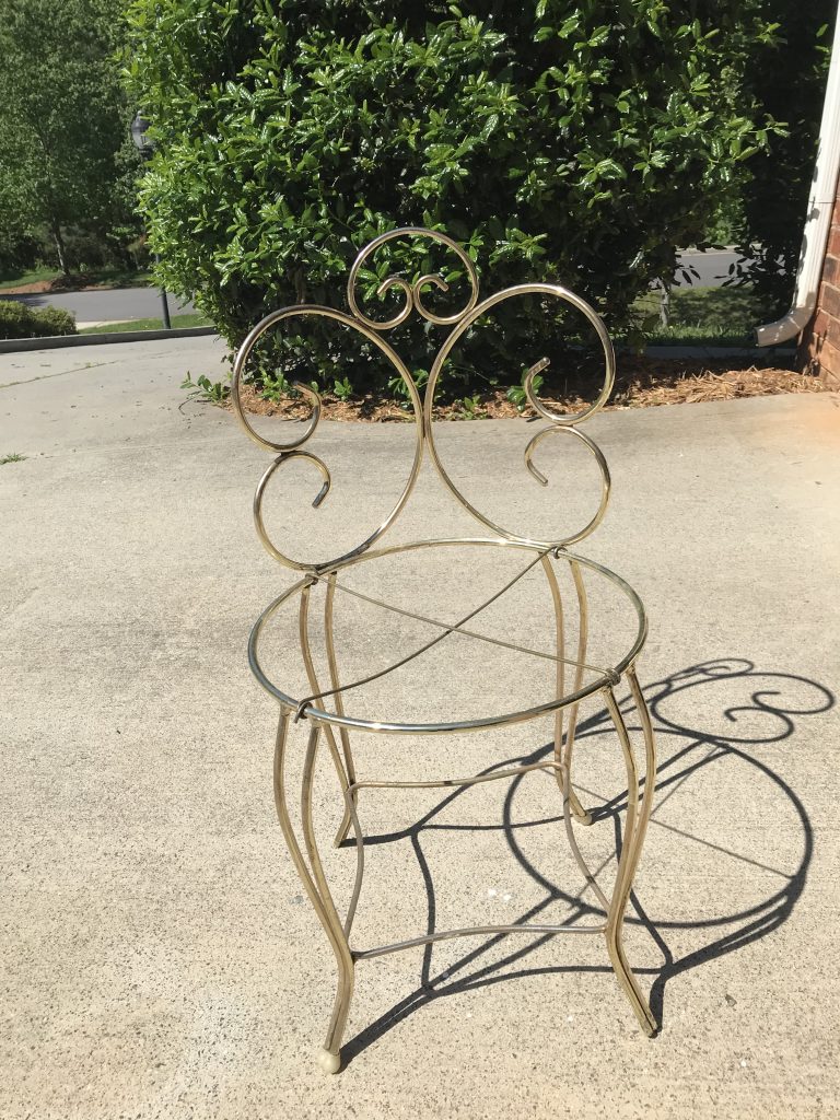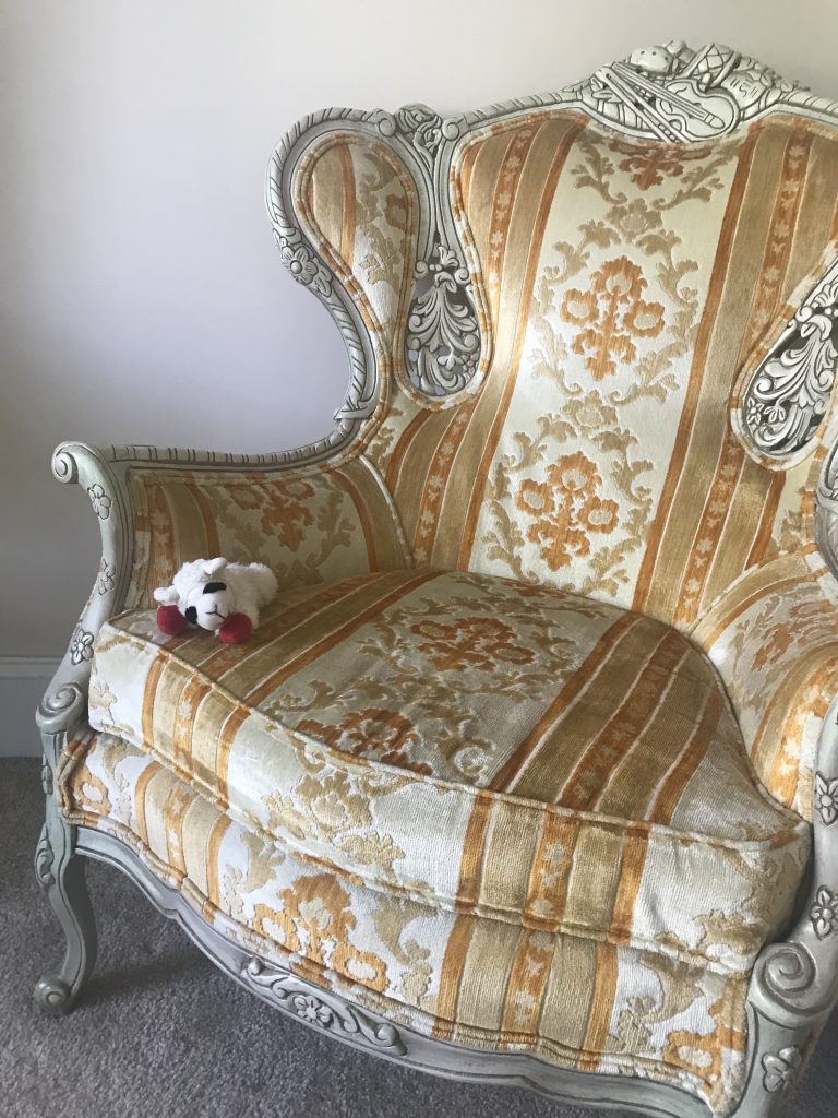This post is an assortment of odds and ends that I refinished as part of the bedroom transformation, but didn’t warrant blog posts of their own. They are little accessory pieces to pull the room together. In that vein, I have to talk about an elephant in the room. So, we all have that one friend that is a liiiiiiiittle too loud and likes attention a liiiiiiiittle too much. They don’t really like to blend into the scenery, they like to stand out. We invite them to the party anyway because even though we know they are a little loud, we really love them and want them around. That is the situation with my Great Aunt’s chair. I was lucky enough to acquire it when she passed and I treasure it. It really doesn’t go with the color scheme, or style that I am going for, but I loved my Aunt so much, so I love that chair. It makes me think of her when I look at it, and brings me joy to sit in it. There is no way I am getting rid of that chair, so my only option was try to blend it in. Somehow. Behold……
