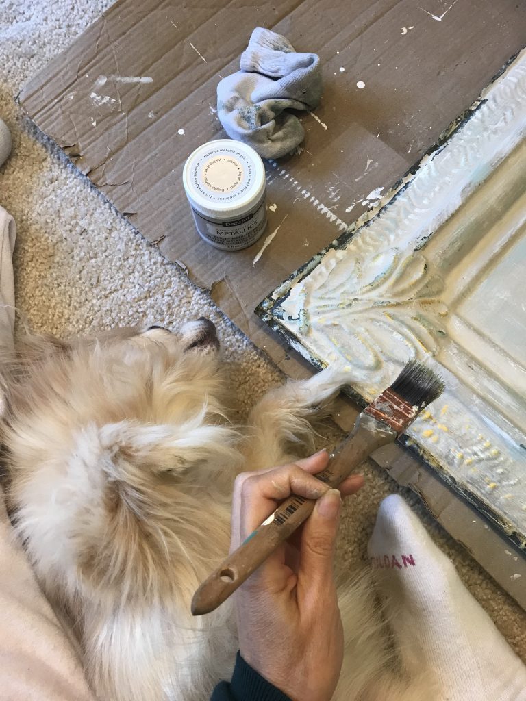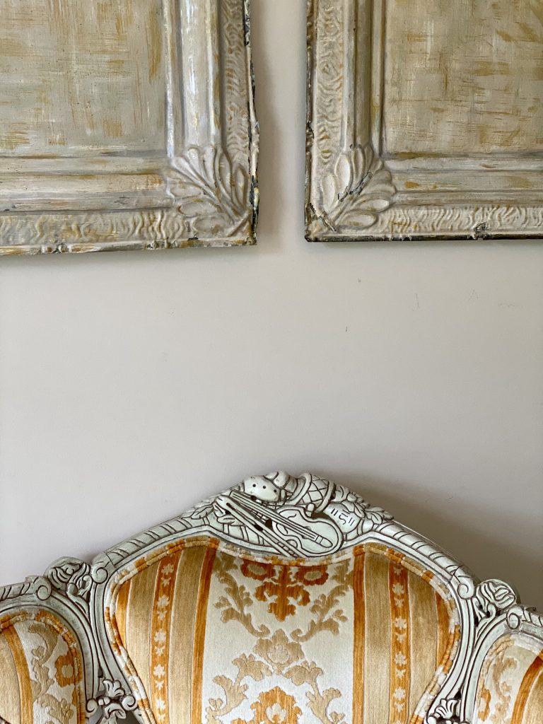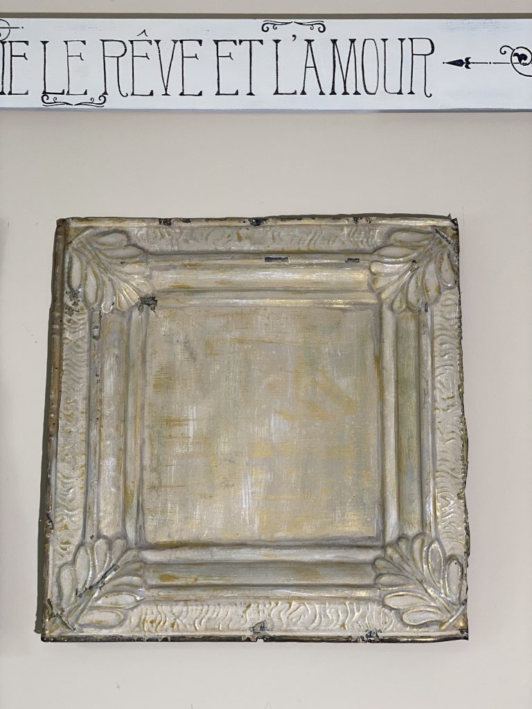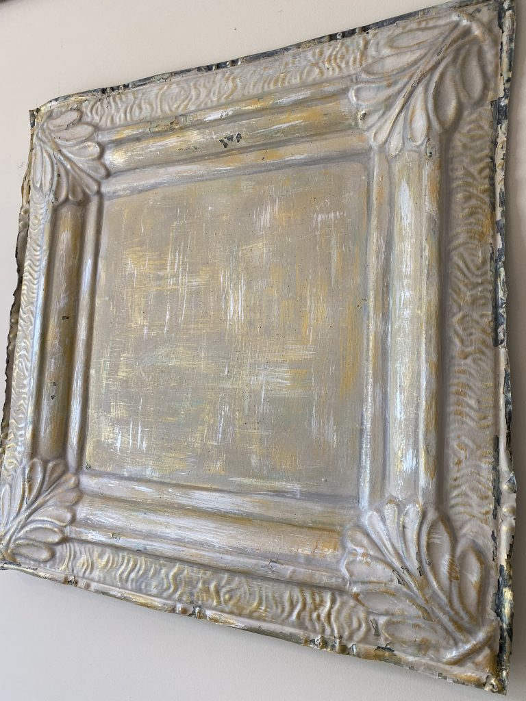 One thing that I did to try and make it blend, is to create some art to hang above it that had some yellow, cream, and gold in it. The stores have been closed due to quarantine, so I decided to get creative with things that I had around the house. I had these two antique tin ceiling tiles that I got for another project, but they didn’t work out. So, I got out some paint and just started brushing it on haphazardly. I wanted the tiles to look metallic, aged, and worn. I started with an off white chalk paint to highlight some of the raised areas and lighten up the base color. I then brushed on metallic gold and metallic silver over the high points, in the crevices, and on the center of the tile. There was no method to this, I just added the metallic paint wherever I thought looked good. To add some patina, I sparingly brushed on a bluish green color – Inglenook by Fusion. Lastly, to add some age, I created a wash with Coffee Bean by Dixie Belle and brushed it into all of the crevices. For a little added interest, I also lightly splattered the wash on top by tapping the brush against my hand.