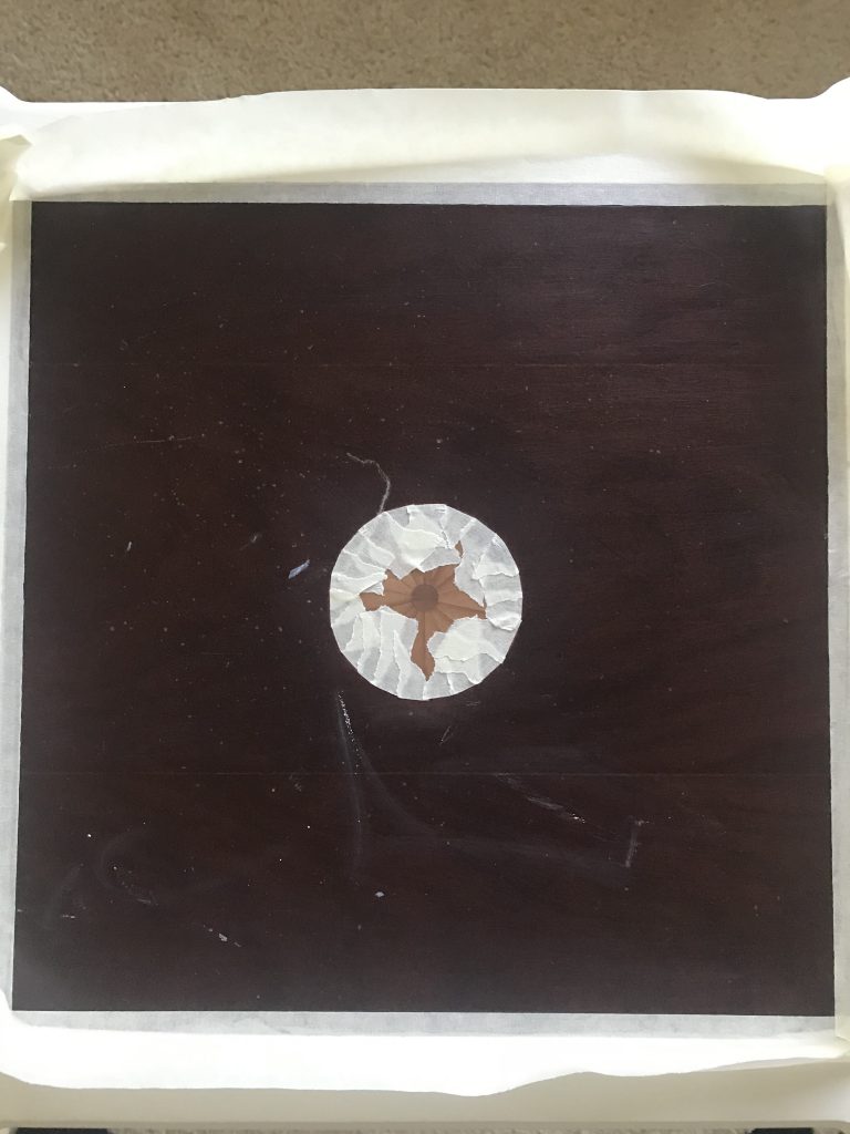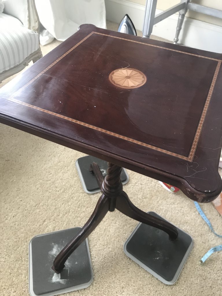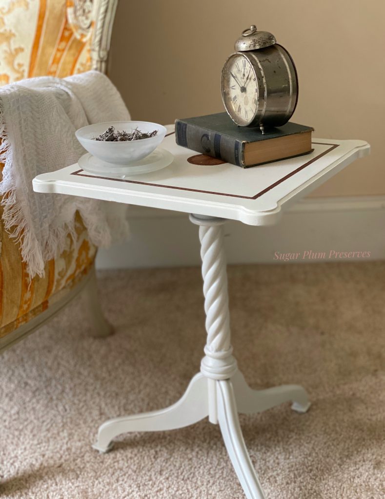 The side table was a curbside pick up that was quite wobbly and scratched. The pin that attached the base to the legs was loose and causing the table to be crooked and wobbly. I separated the legs from the base and reattached it with liquid nails, making sure that the table was level. I taped off the nice inlay work and painted a few coats of Raw Silk by Fusion. It now sits proudly next to our guest of honor.