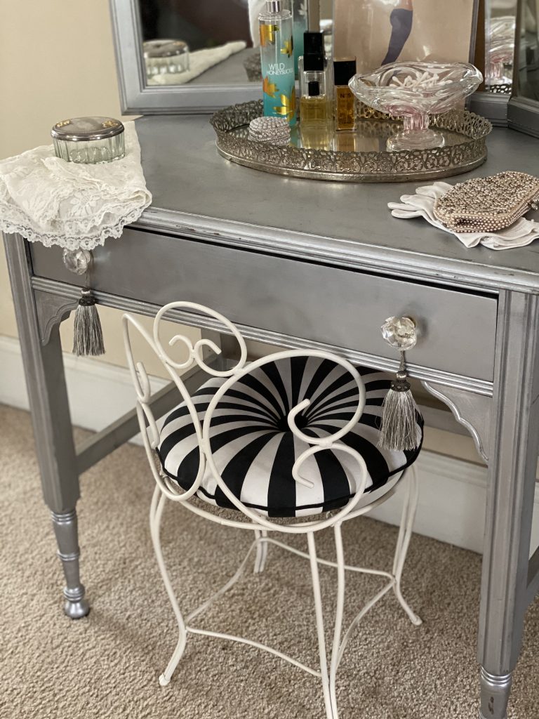 Two last little transformations are a side table and a vanity chair. The chair was simple. I just spray painted it with my favorite “not bright white” white paint, Rustoleum Heirloom White, and added a black and white cushion to tie in the sign.