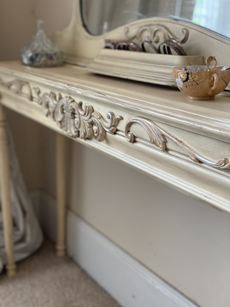 To tie in the artwork and blend the chair further, I gave the same treatment to the little table and mirror that I already had. I used the same colors as the tiles (gold, silver, and coffee bean wash) and highlighted to bring out the details. You can also see in the reflection, I relocated a piece of artwork into the sitting area to bring a little orange to the space to tie in the chair. I’m really trying to make my well-loved friend more comfortable at the party! 😉