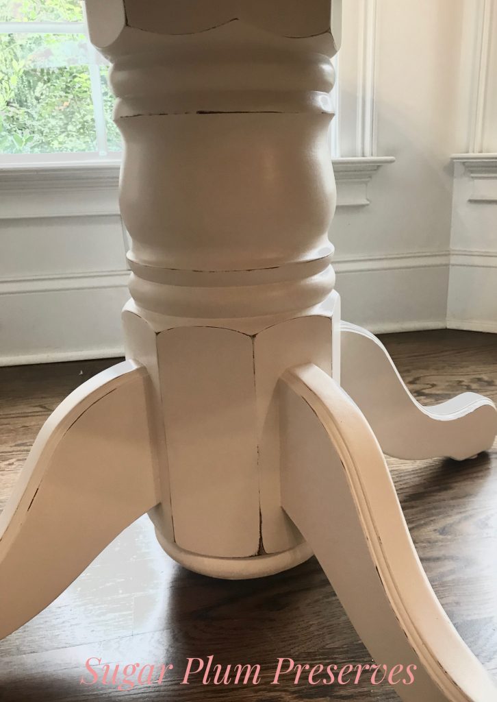 For the base, I opted to use a homemade chalk paint because I wanted that velvety finish that chalk paint has. I used a simple recipe of one part calcium carbonate (chalk) to two parts paint. There is a link to the calcium carbonate that I use in the materials list at the end. Mix the calcium carbonate in a little water first to liquify it and get out any clumps. Once the calcium carbonate is mixed well and liquid, add it to the paint. I chose Bit of Sugar by Behr and applied two coats to the base and trim on the table top.