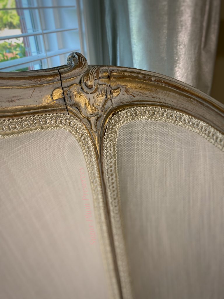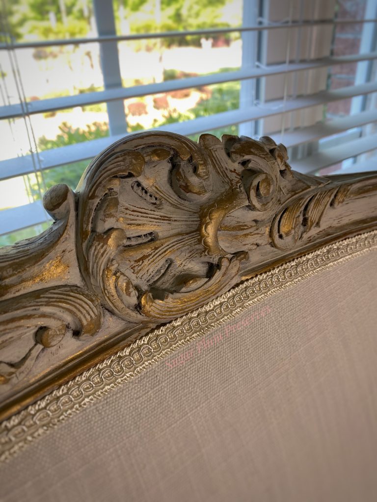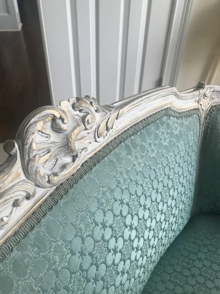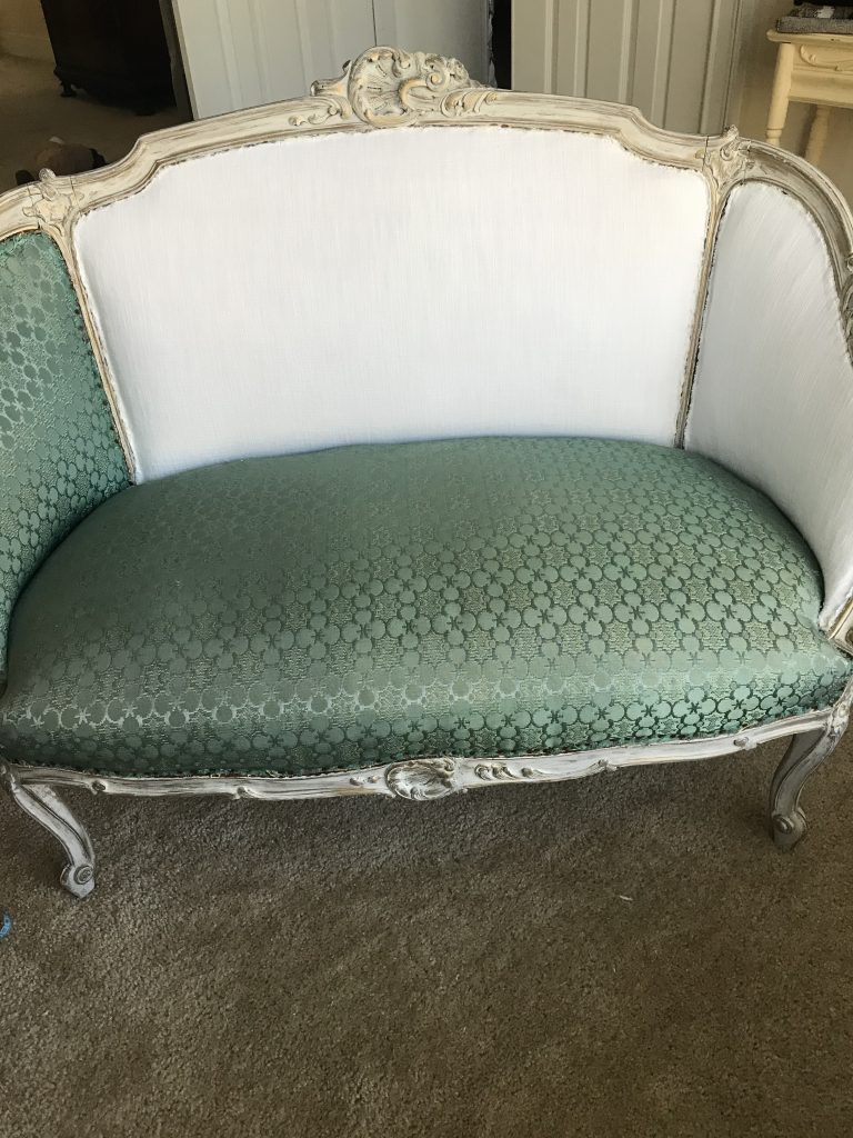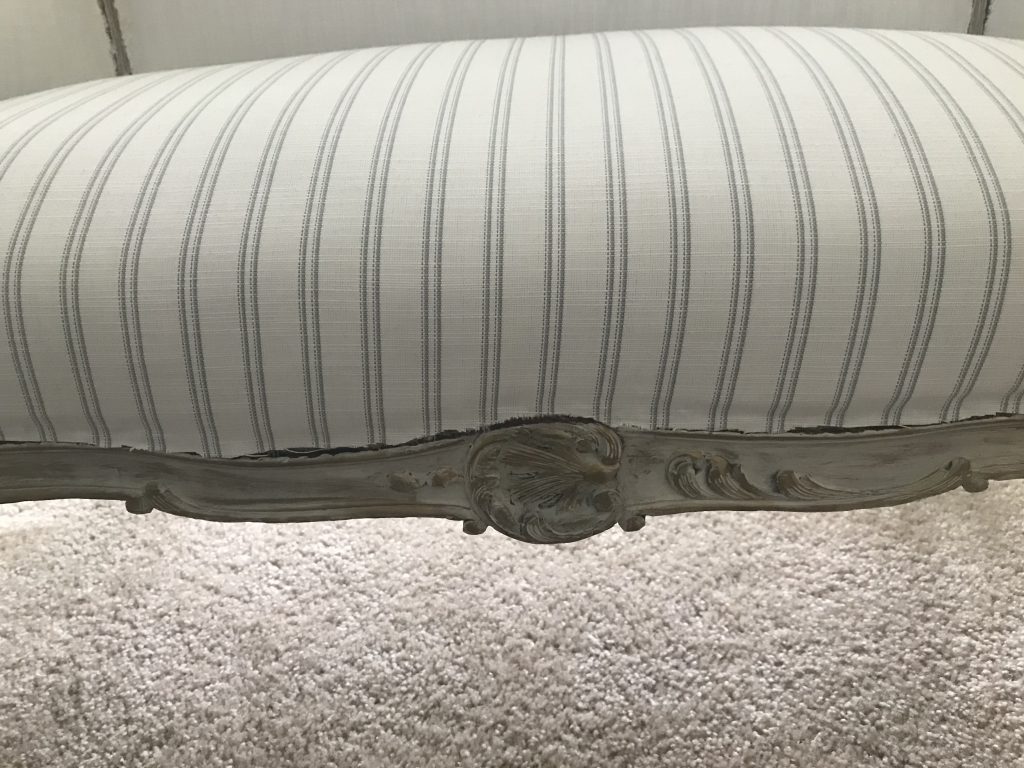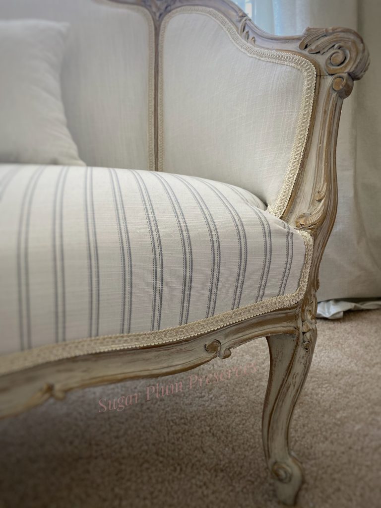 There is a separate little area in our bedroom that I want to turn into a proper sitting area, as part of creating a cohesive, pretty, comfortable bedroom retreat. To this end, I have long been on the lookout for a pretty settee. After weeks of searching, I found one on Marketplace for $125 that looked perfect. Honestly, that was a little pricey for me, since I usually find pieces that need a lot of work and get them for next to nothing. But since it was for us, not resale, and I wanted to be sure that I got a piece that was structurally sound, I jumped on it. I had seen other similar settees for quite a bit more money and knew it wouldn’t last long. I liked the color and thought I could work with it and would not have to reupholster it…….The key word here ended up being “thought”. **hmmph** Read on to see how I transformed this “ok” settee into a French inspired beauty.