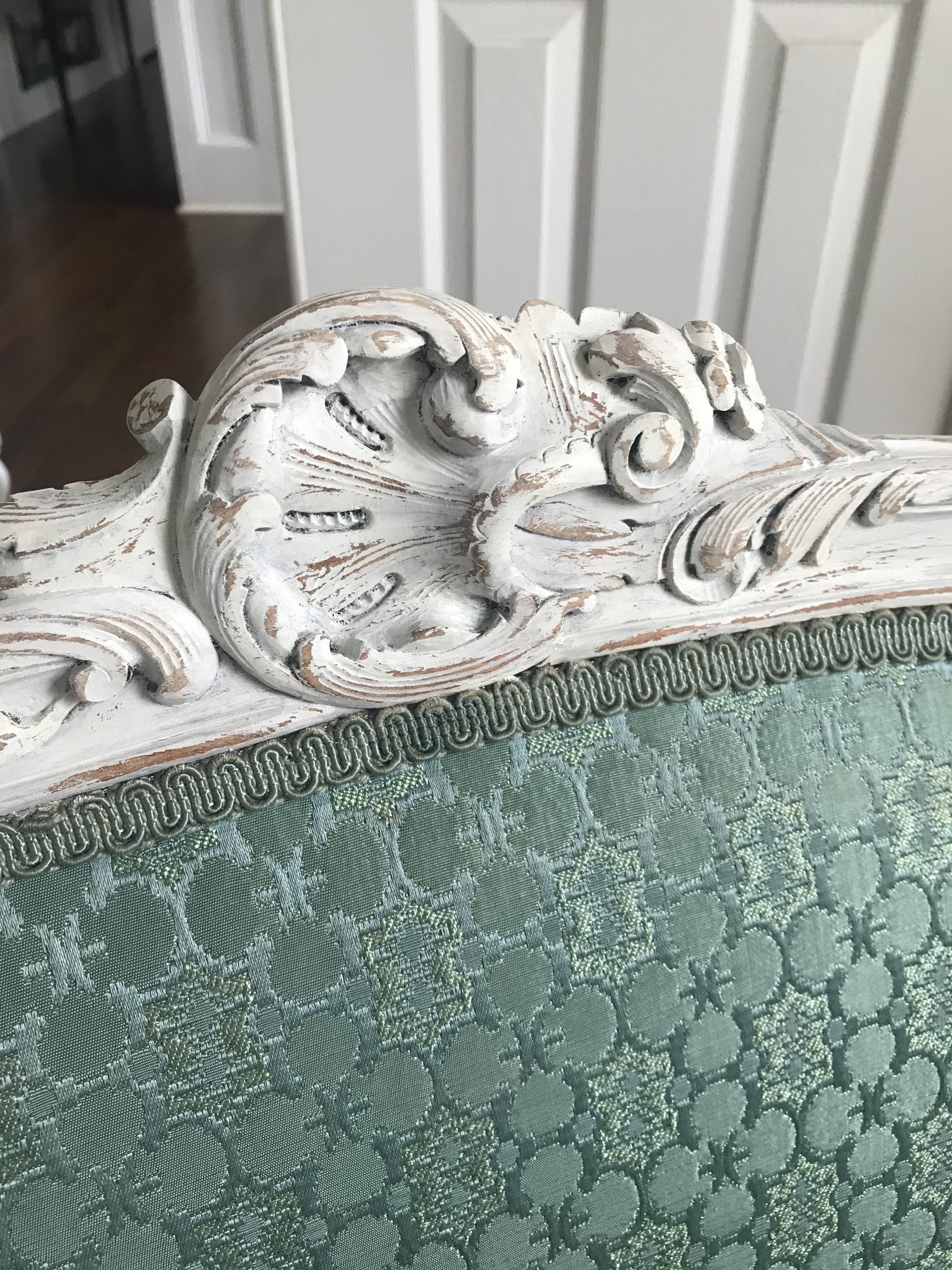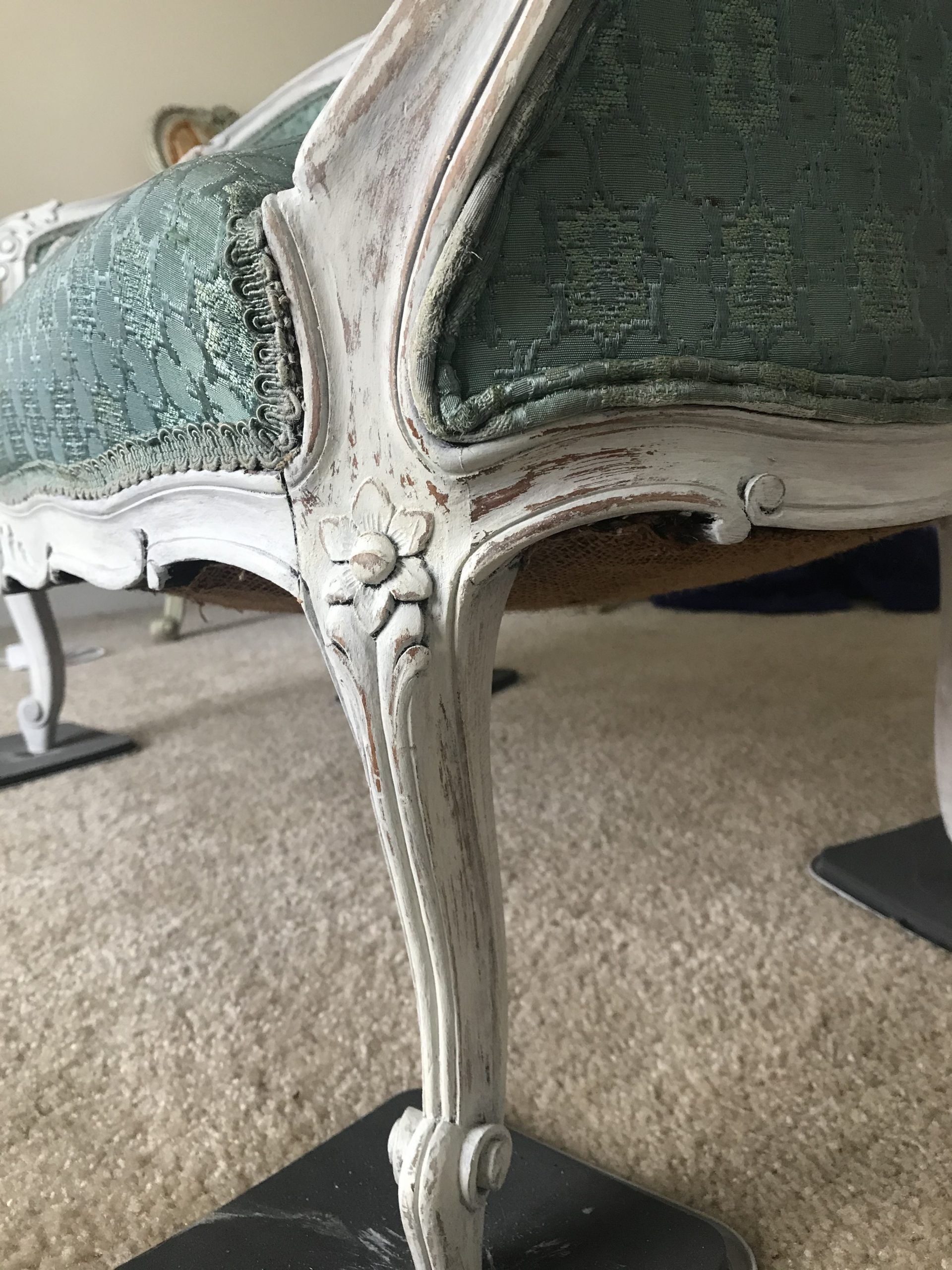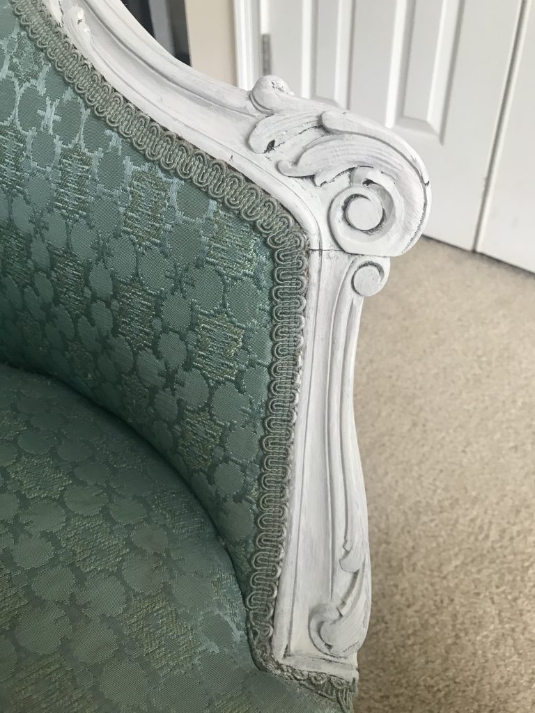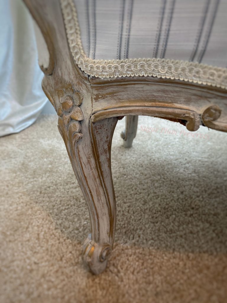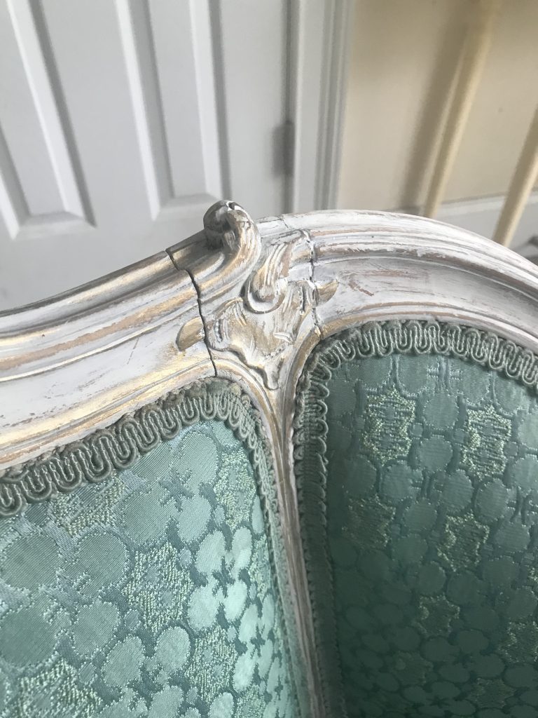 There is a separate little area in our bedroom that I want to turn into a proper sitting area, as part of creating a cohesive, pretty, comfortable bedroom retreat. To this end, I have long been on the lookout for a pretty settee. After weeks of searching, I found one on Marketplace for $125 that looked perfect. Honestly, that was a little pricey for me, since I usually find pieces that need a lot of work and get them for next to nothing. But since it was for us, not resale, and I wanted to be sure that I got a piece that was structurally sound, I jumped on it. I had seen other similar settees for quite a bit more money and knew it wouldn’t last long. I liked the color and thought I could work with it and would not have to reupholster it…….The key word here ended up being “thought”. **hmmph** Read on to see how I transformed this “ok” settee into a French inspired beauty.