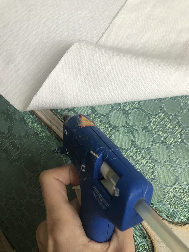 From the pictures so far, you may be thinking, I actually like the fabric, it looks pretty with the white paint. I agree. The color was pretty with the new paint job, distressing, and gold wax. However, there were some stains that I couldn’t live with, the trim was so old it was crumbly, and the color of the fabric still didn’t work in the big picture. That sent me to the antique mall, where I picked up two different fabrics. One was a textured cream chenille fabric, the other one was a striped, thicker, almost grain sack look. I was torn between them, so I went with both. I reupholstered the body with the cream, and the seat with the striped. I have reupholstered several pieces using the traditional staple gun method in the past. This piece is pretty old and I wasn’t thrilled about creating more holes in the wood with the staple gun. I turned to google and found someone that had used a glue gun to reupholster. Hmmmm….🤔 If it was for resale, I wouldn’t have tried it, but it is for us, so what the heck? And that is what I did. I reupholstered the whole settee with hot glue and it worked like a charm (aside from a few hot glue burns)!