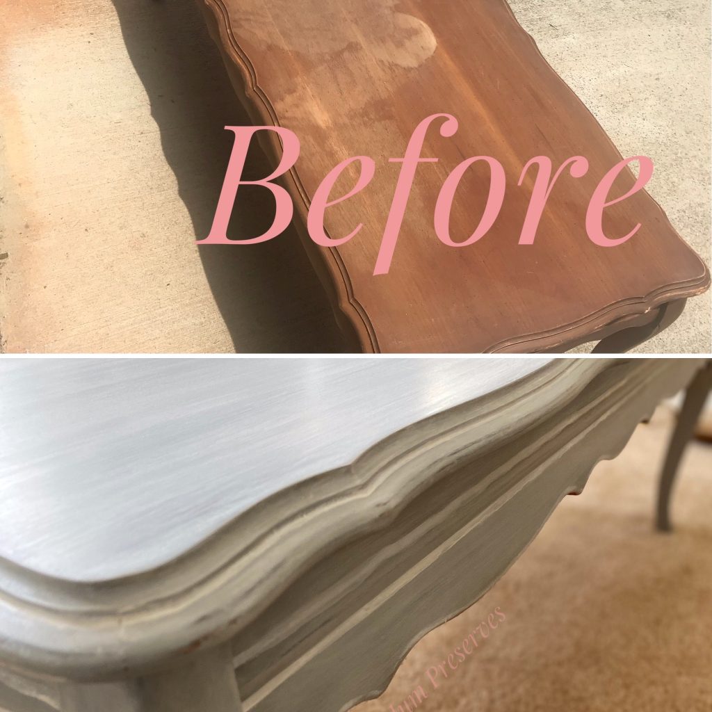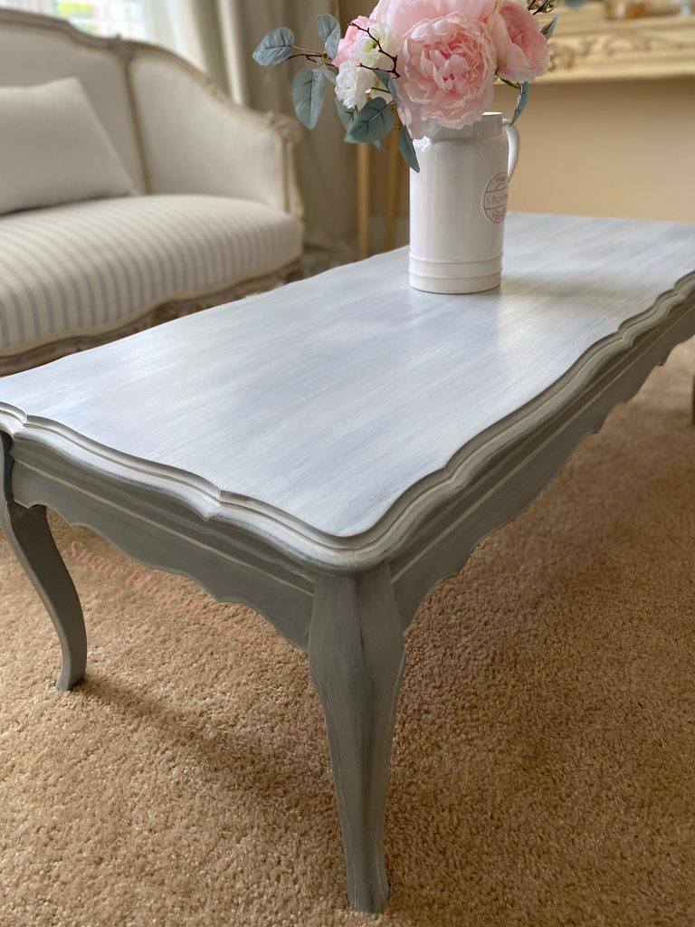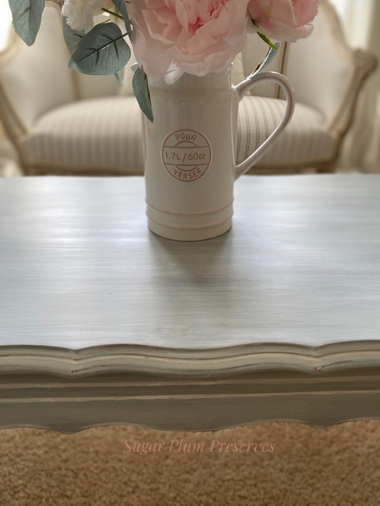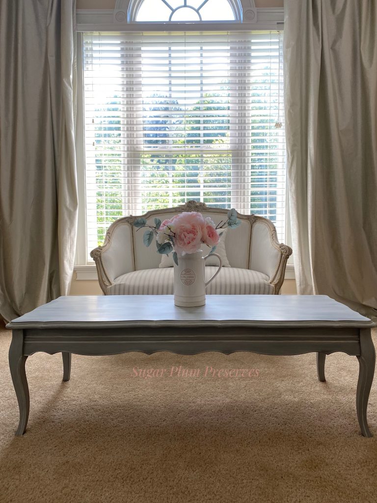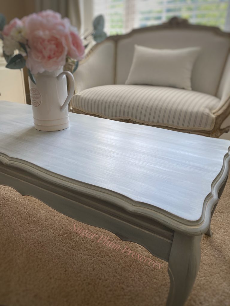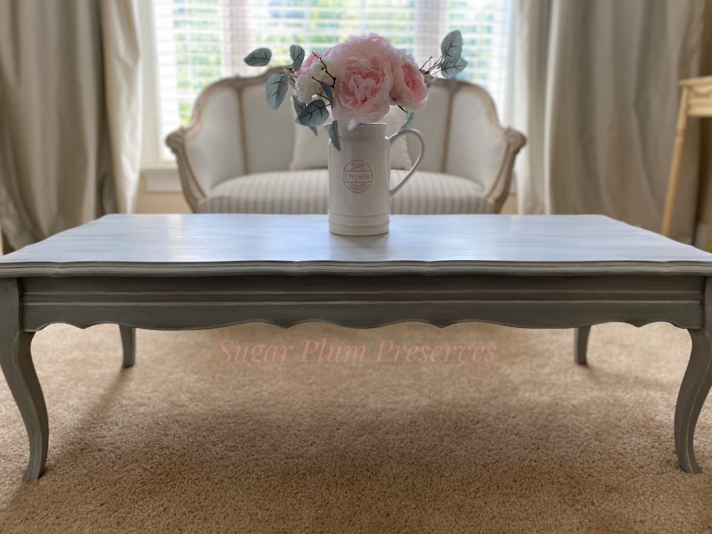 Every sitting room needs a coffee table, so after I completed Chou A La Creme, that was next on the list. I got this French Provincial coffee table and two matching side tables at an estate sale for $20. The side tables didn’t work in the sitting area, so they will be saved for a later project. I decided to keep the table simple, and paint it gray with a white wash and light distressing. Check out the before and continue reading to see how I got to the after.