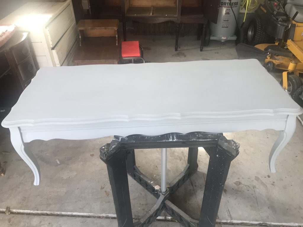 I thought it looked pretty good after that, so I sealed it with a matte polycrylic topcoat and placed it in my sitting room. It was then that I realized the gray color was off – it had too much blue for my taste. Back to the shoppe it went. I mixed up some of the white chalk paint with water – about 50/50 to create a wash. I haphazardly painted on the watery mixture and went back over it with a wet rag to blend and remove paint. I did this over the top, skirt, and legs. I loved the layered look that was being created, so I decide to distress the curves, top, and high points on the table. I did this by wet sanding with 220 grit sand paper and a mister bottle.
