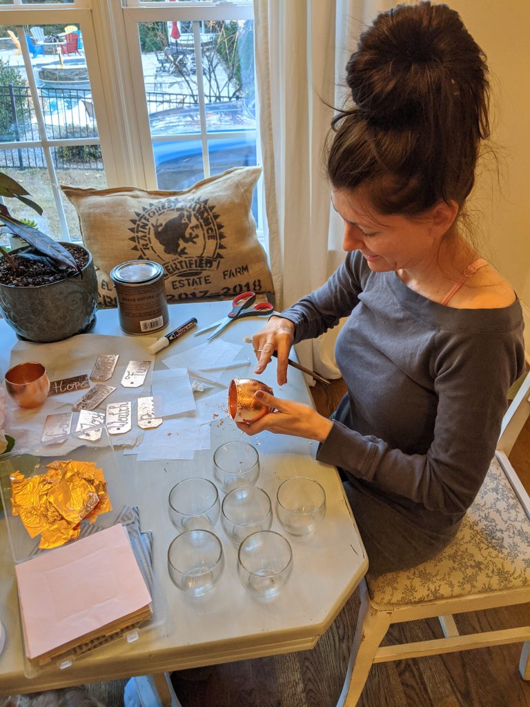 Next up, the votive holders! I used inexpensive glass votive holders – like these https://amzn.to/3p4uOjX and covered the outsides with the rose gold leaf. What? You didn’t know that you could gold leaf glass? YES, you can! Isn’t that great news? It opens a whole range of crafting possibilities! 💁🏻♀️ You apply it the same way you applied it to the tags. Again, just make sure it’s on the outside because you will be putting a candle on the inside and I don’t think that would be a good idea!