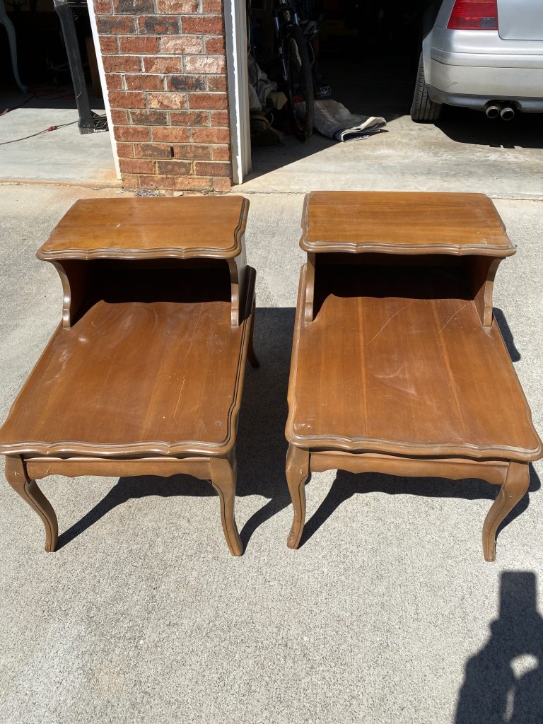 I started with these two yard sale finds. They were in good shape structurally, solid wood, and had beautiful lines. The negatives were the ugly outdated orange stain and some deep scratches on the top. Here’s what we started with: