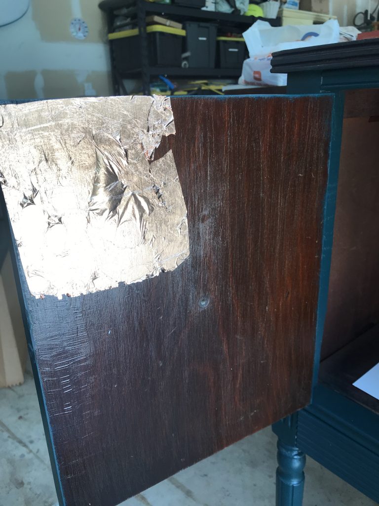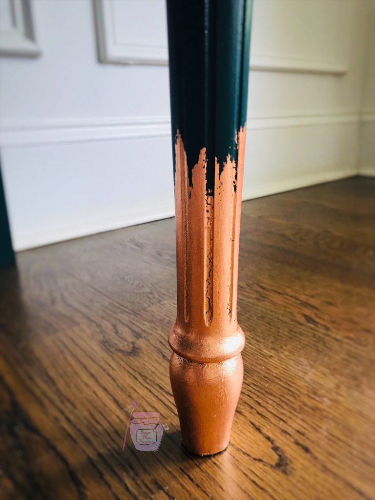 I felt like this old girl needed some glamour! I also thought that copper leaf would look so beautiful with this color, soooooooo…..see where I am going here?? I had rose gold leaf on hand, which may have been fine, but I was convinced that copper leaf was a slightly different shade. After all, I was going to name it Penny Candy! Am I crazy, I don’t know, but I went to Micheal’s for copper leaf none the less. 🤔 I have gone into detail about how to apply leafing in another blog post https://sugarplumpreserves.com/2020/04/12/madeleine/, so I will just briefly go over the process here. Apply the sizing, Gold Leaf Sizing, Quart size https://amzn.to/36hdOxP or Gold Leaf Sizing, 2 oz https://amzn.to/3bN5xTt with a disposable chip brush, 3 inch, 24 pack https://amzn.to/2WNntJf. The sizing goes on white but will dry clear. Once it is dry, gently press the leaf https://amzn.to/3RaH3IZ onto the piece, smoothing out with a natural bristle brush.