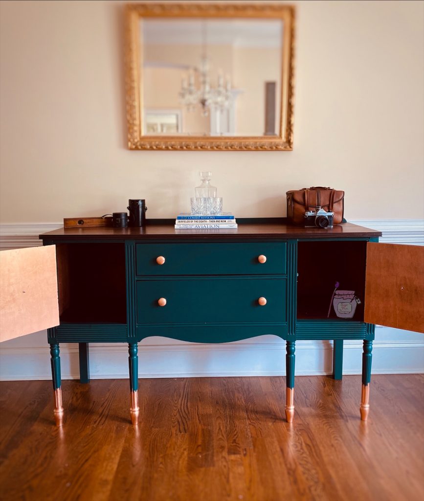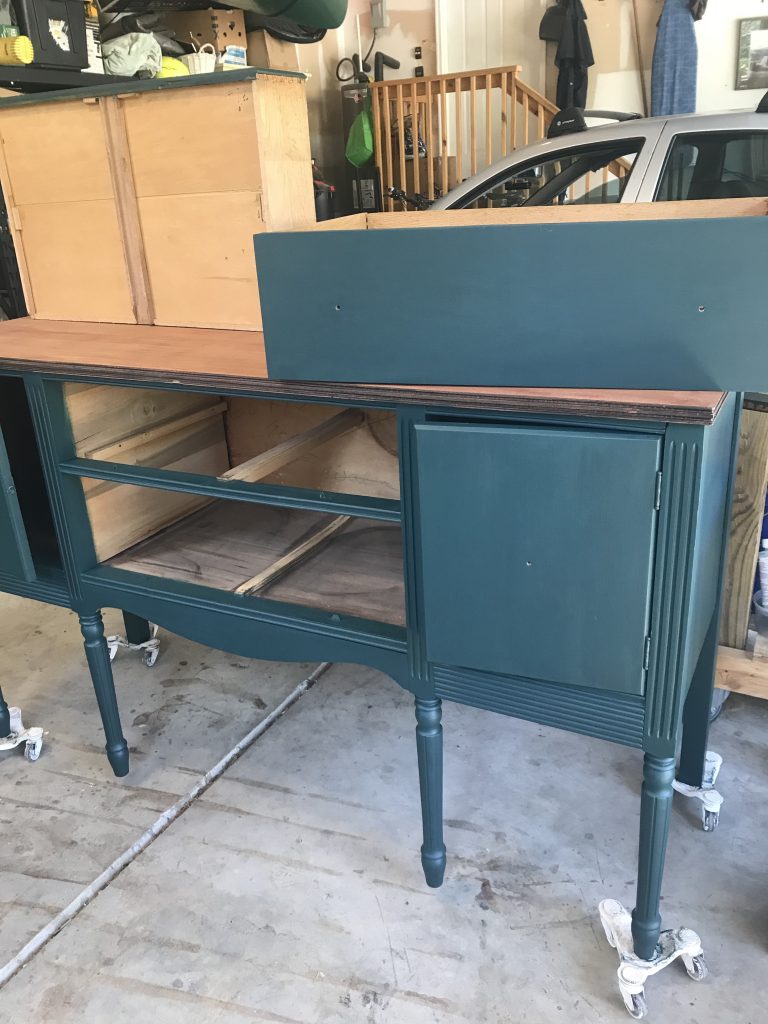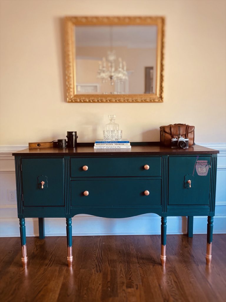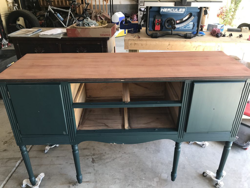 After wiping the whole piece down with a wet rag, I was ready to paint. I opted not to prime this piece because I sanded really well, so there wouldn’t be an adhesion problem, and the color was dark, so there wouldn’t be a problem with bleed through. The color that I chose was……..drum roll……Night Watch by PPG. The color is a gorgeous deep, moody green that actually looked better in person than in the photos. I applied it with my favorite paint brush, Angled 2 inch Stubby https://bit.ly/3oI0V9z. Pro tip, these dollies are a life saver to move the piece around as you’re painting and to get the piece up off the ground – 3 Wheel Dolly, 4 pack https://amzn.to/3bKfilf. After I painted, I noticed that there were some areas that needed to be touched up with wood filler. Not to worry! I got out my trusty wood filler, Dixie Belle Mud – https://amzn.to/2zfMdRB and filled in the spots.