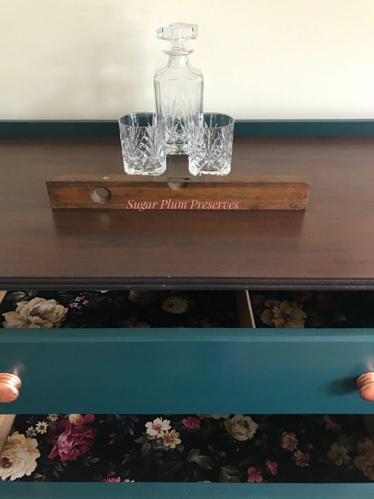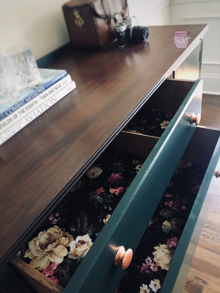 Last, but not least, it needed beautiful matching fabric to line the drawers. I found this fabric at Hobby Lobby and I really feel like it completed the moody, luxurious look that I was going for. Much better than yucky, old, stained, paper tacked in! Amiright???