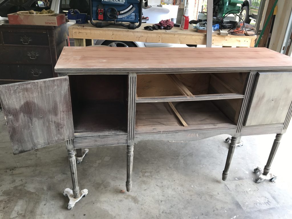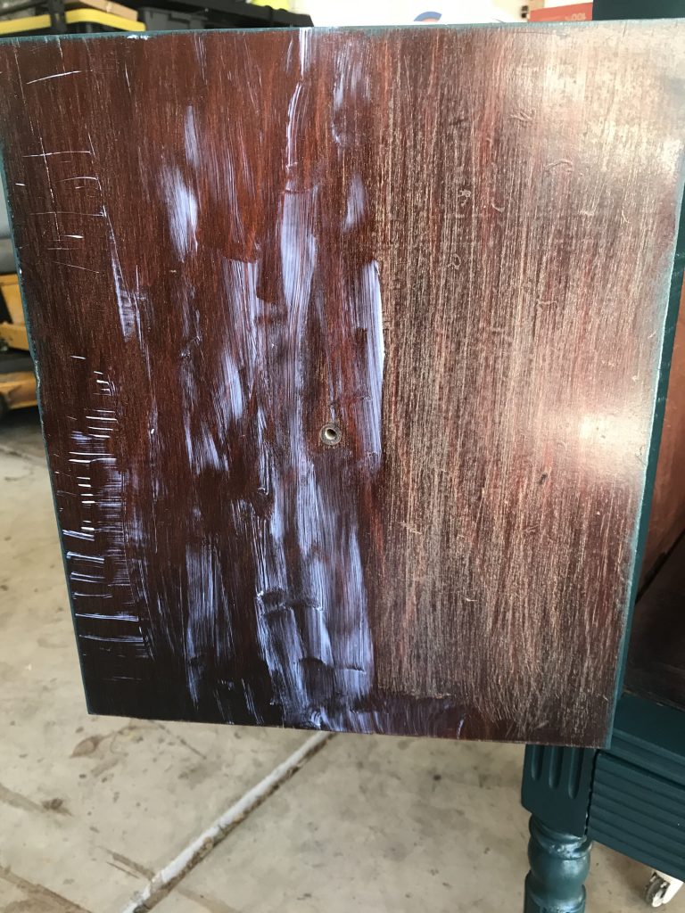 I removed the paper liners and started with my usual, a GOOD clean! I used a mixture of warm water, dawn dish soap, and white vinegar and scrubbed WELL. The top of the buffet would need to be sanded down pretty significantly to remove the gauges. If I was going to paint the top, then I would have just filled them with wood filler, but I was hoping to get the scratches out and stain the top. It took a lot of sanding with my orbital sander – https://amzn.to/3mOzGsi, my mouse sander – https://amzn.to/2Yf42cT, and hand sanded with sand paper. I was very pleased to have been able to sand past the scratches for a smooth top.
