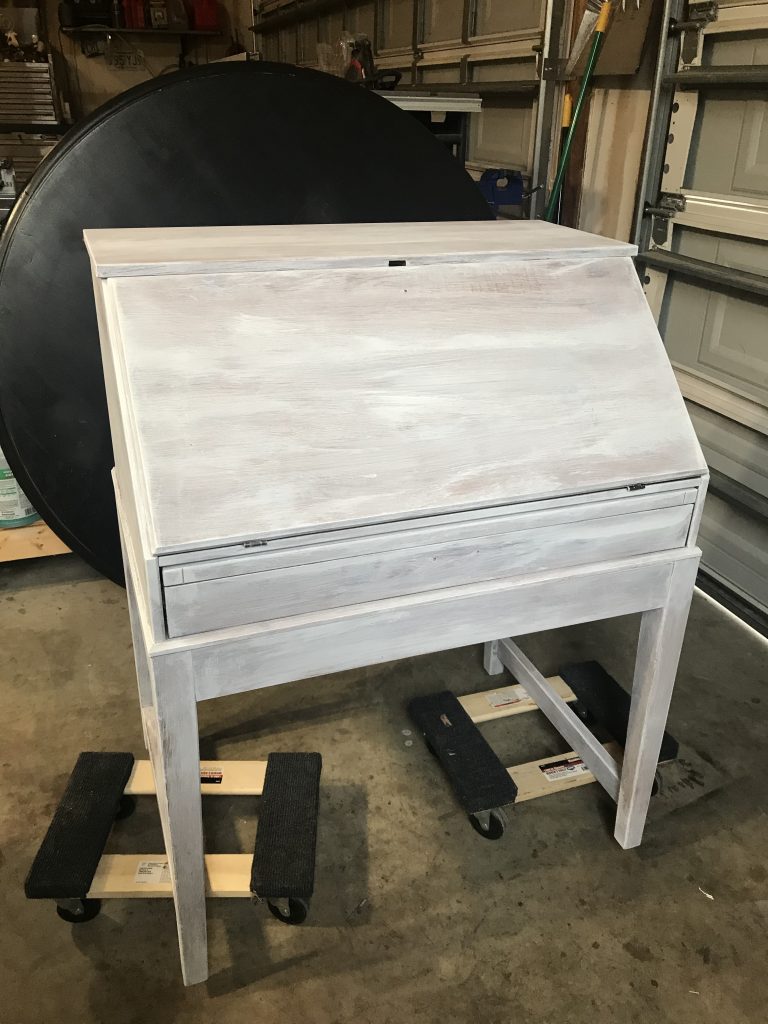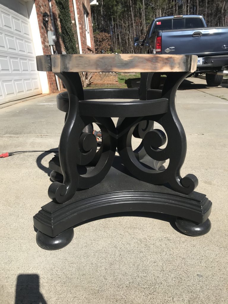 My customer had found the piece inexpensively on Marketplace and wanted to duplicate the expensive tables featured in the Restoration Hardware catalog. The piece was covered in a weird black chalk paint that was easily scratched off. I forgot to take good before pictures, but remembered as I was sanding the base and you can see the table in the background of the desk that I was priming. Sorry, but these are the best “before” that I have.