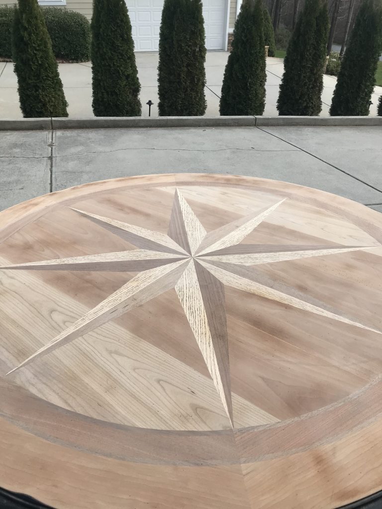 I liked the way the base looked but the top still showed the compass pattern and it looked too perfect, not weathered. Maybe I’m a little crazy, but with permission from the owner, I got out my hammer and used the back end to create some divots in the wood. Better, but still not right. I sealed the whole piece with several coats of polycrylic because I decided to “dirty” up the piece and give it a little more texture with dark wax . I went over both the base and the table top with the dark wax, leaving some areas more “dirty” than others. It looked a little too uniform, so I got out my white wax https://amzn.to/2APzW6V and a painters brush and added little streaks of white here and there. I replicated the same on the base. I like to use wax in this way on table tops and not as a topcoat because it is not as durable at the polycrylic https://amzn.to/36h3kys and would need to be waxed again in the future. Since I sealed it first, it will remain durable and the wax layer will only look better as it wears on this style of finish.