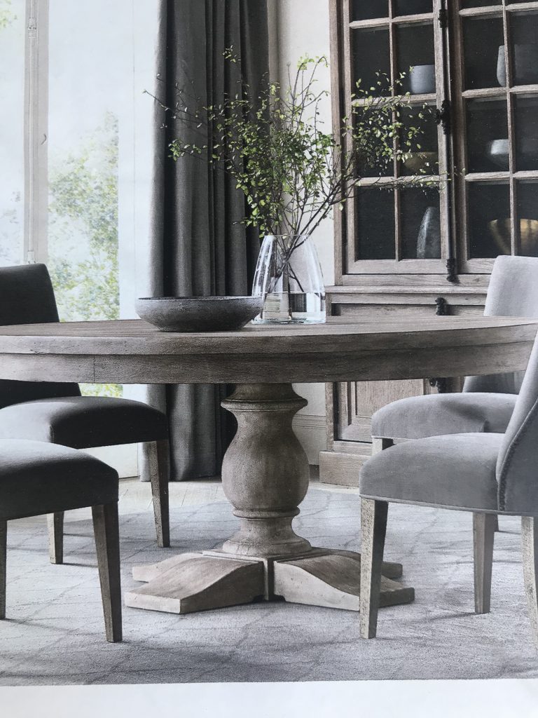 As pretty as the inlay was, it presented a new problem ~ I was going to be creating a weathered faux grain, but this had it’s own “compass” wood grain to contend with. What I thought would be a simple paint and glaze technique turned into a more complex job. In hindsight, I may have done a layer of wood filler to hide the grain because it kept showing through the paint. Since I did not do that, I created more work for myself as it took many layers of paint, glaze, and wax to create a new faux wood grain. Below is the inspiration picture of the Restoration Hardware table. The owner of the table wanted her piece to be less gray and more brown, but liked the weathered look.