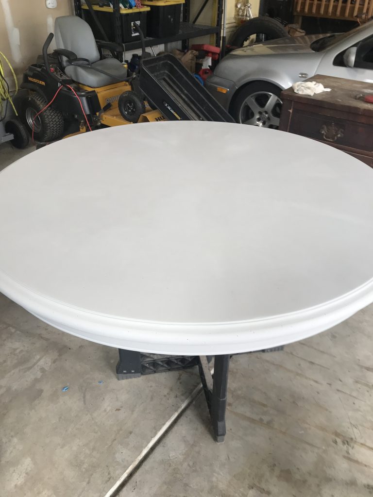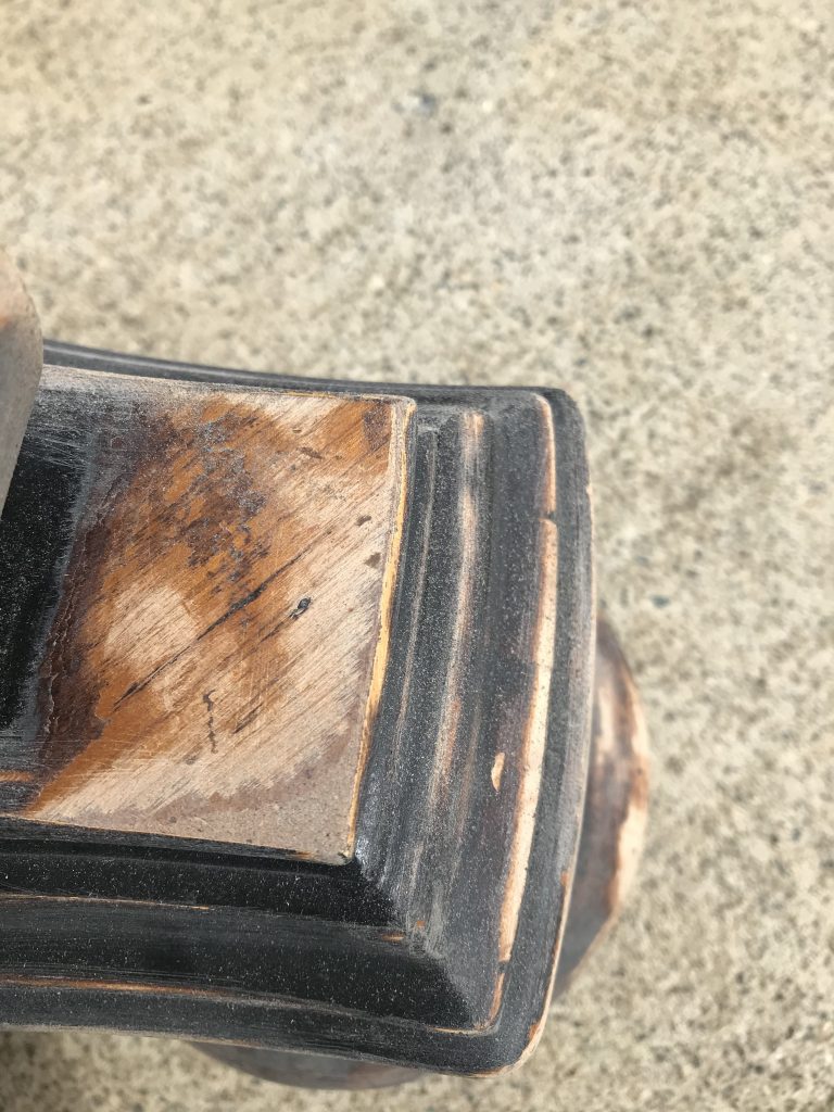 In order to achieve the look she wanted, I would need to remove all of the old paint first. In doing so, I discovered that the table top was solid wood, but unfortunately, the base was not. I sanded (with my trusty detail sander https://amzn.to/2Yf42cT) through some of the veneer to reveal pressed wood on the base, but sanded the top (with my equally trusty orbital sander https://amzn.to/3mOzGsi) all the way to the wood to reveal a gorgeous wood inlay! Clearly this base and top were not originally meant to be together. I FaceTime’d with the owner to show her the beautiful tabletop underneath and to make sure that she wanted to paint it. Normally, I am ALL for painting a piece, but in this case, I was surprised when she said to continue as planned because the inlay was not her style. Okay! I am up for the challenge! Continue as planned.