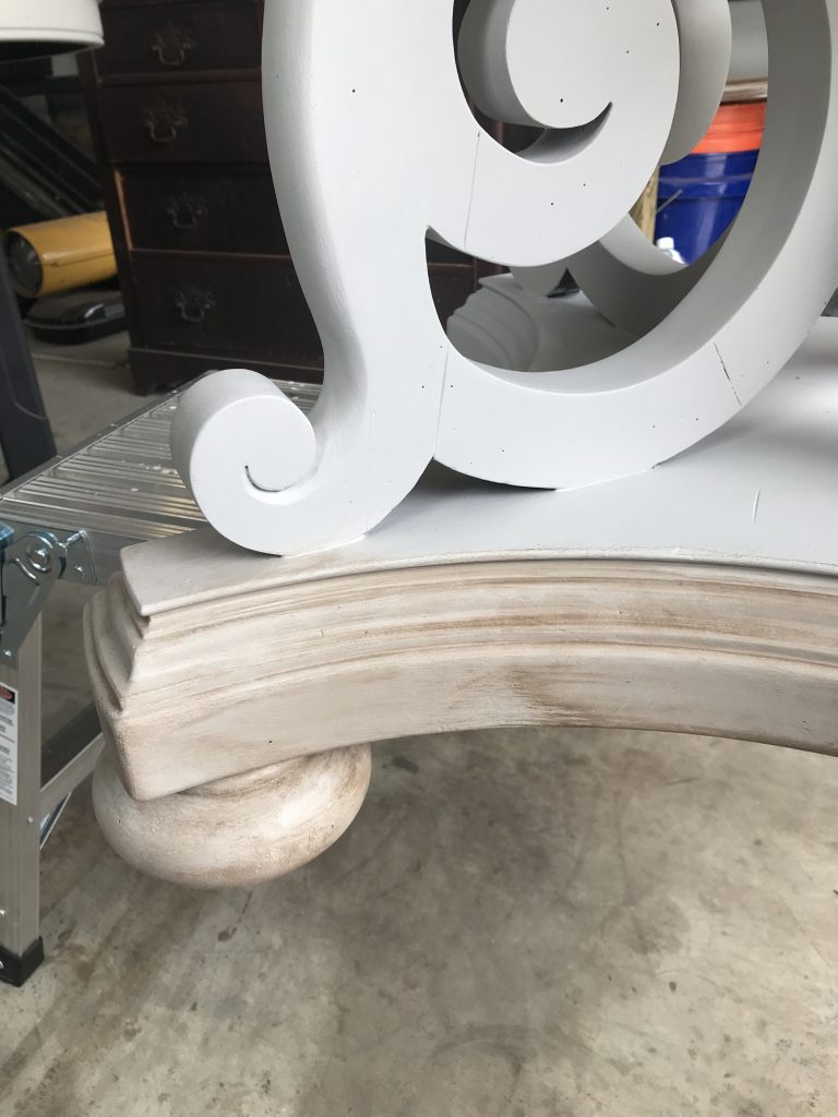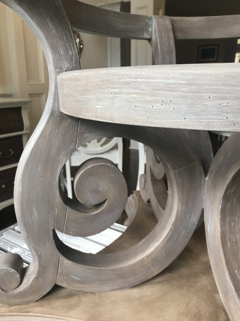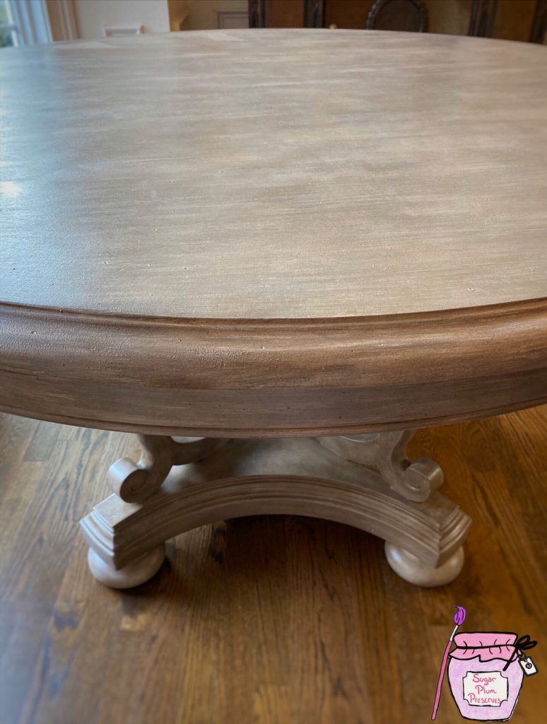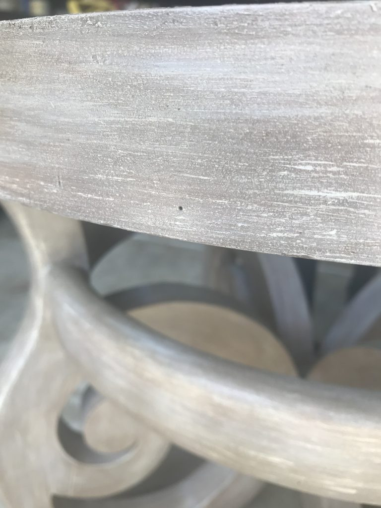 I went over the whole table and base with this method. It was a good start, but it honestly looked too “flat” and the compass pattern was still showing through the paint and glaze. I decided to dry brush some white paint and two shades of gray paint ( a light and a dark). You can see the difference in the look between the bottom of the base and the scroll work and in the table top.