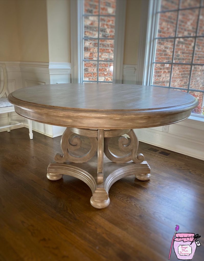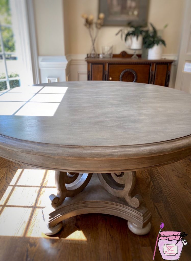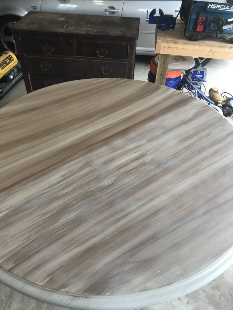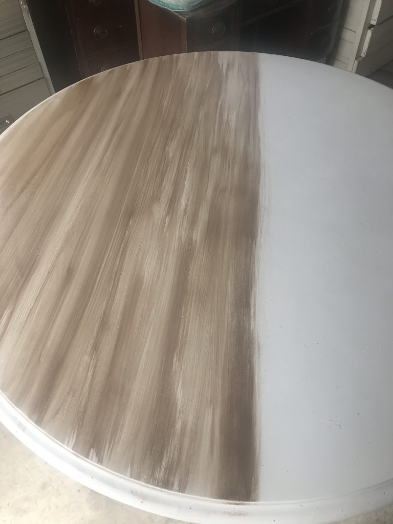 I went over the whole table and base with this method. It was a good start, but it honestly looked too “flat” and the compass pattern was still showing through the paint and glaze. I decided to dry brush some white paint and two shades of gray paint ( a light and a dark). You can see the difference in the look between the bottom of the base and the scroll work and in the table top.