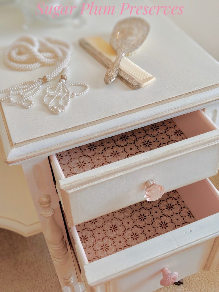 The final bit of pretty that I had in mind was a lovely surprise when the drawers were opened. I painted the insides of the drawers with Champagne Blush from Valspar. It perfectly matched something that I couldn’t wait to find a use for – vintage wallpaper!! I found this amazing vintage wall paper from the 50’s while on the 100 mile yard sale in North Carolina/Virginia. I scored a whole roll for $1!! It has these fun, almost abstract, floral patterns with dots of metallic gold. The thickness of it made it the perfect drawer liner. The paper was cut to size, adhered, and sealed with decoupage medium https://amzn.to/3cV0eD2. I knew this last detail would give it that vintage glamour that I adore!