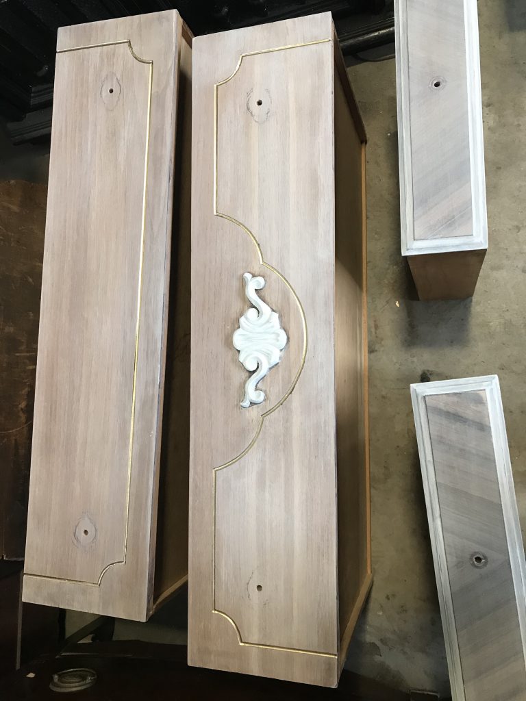 The age old question resurfaced – to prime, or not to prime? Again, if i were planning on selling this piece, I definitely would have primed. Since it was “just” for me, I let it ride. I figured the worst thing that would happed is that I would have to go back and prime and repaint if there was bleed through. As I was working on them, I often found myself saying to myself, “ehhhh, it’s JUST for me, soooo…….” and wanting to cut corners or not make it as special as I would if I were selling it. I feel like there is a life lesson in here. Toward the end of the project, I caught myself and thought, why should I not make it as beautiful for myself as I would for someone else?? Can anyone relate to this type of thinking? Well, once I changed my internal dialog, that’s when the gold leaf came out! 😉👸🏻💁🏻♀️