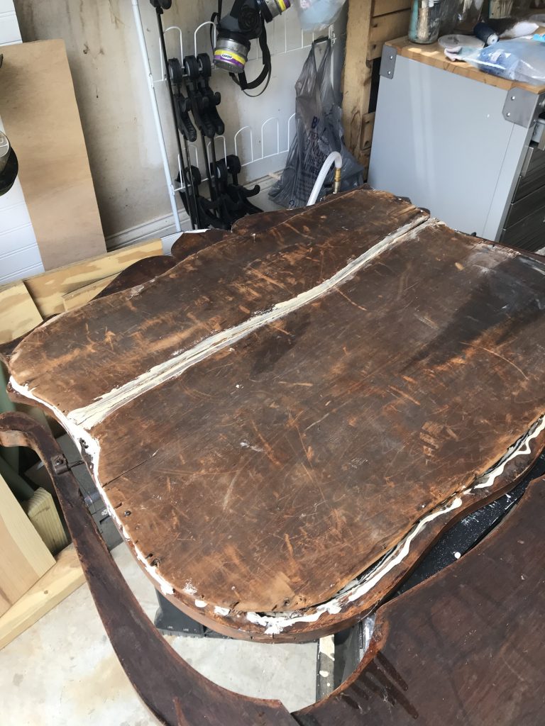 The backing on the mirror was warped and falling off. My hack-job repair had served it’s purpose, but it was time for an actual repair. I removed the old back and replaced it with some luan that I cut to fit with my jigsaw, and wood glue. More of the silver came off with the old backing, but I think it just adds to the cool aged feel. I cleaned the mirror and the dresser well with krud kutter and wiped them both down with a wet rag.