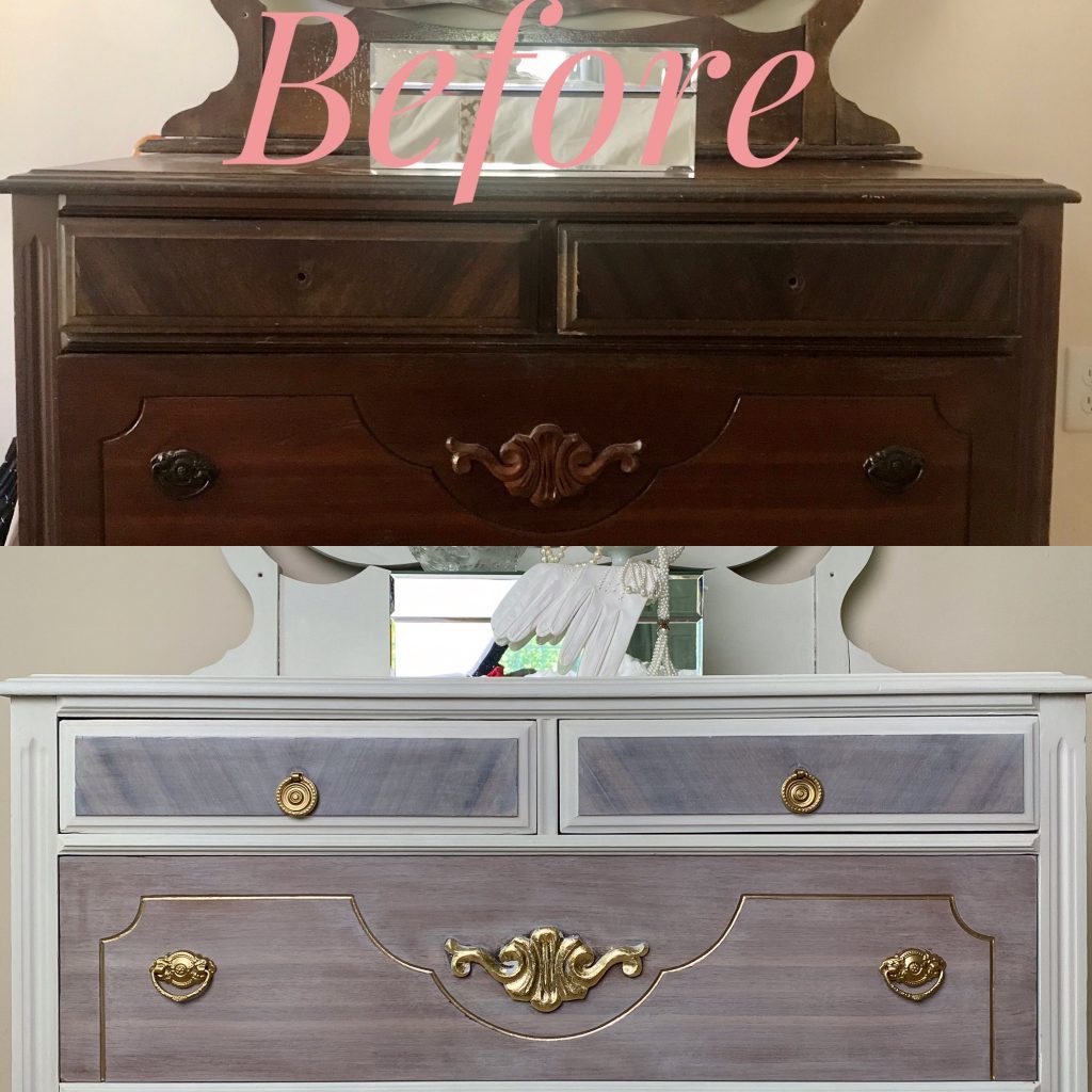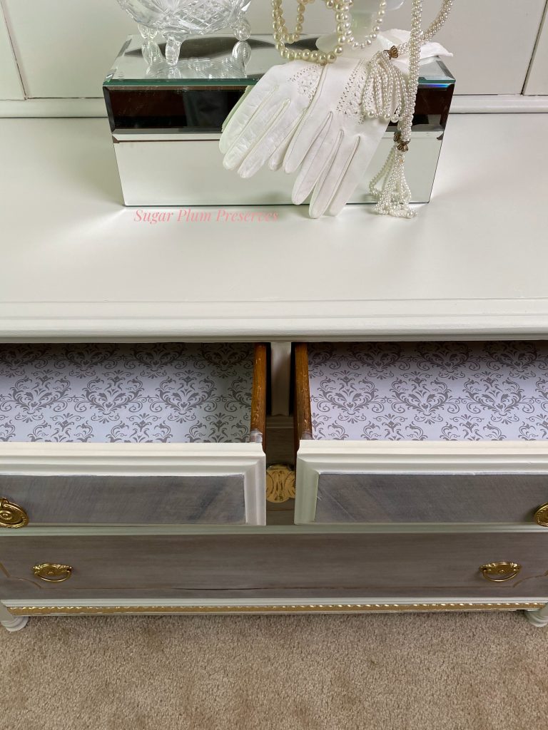Lastly, I spray painted the hardware gold, and lined the drawers to match Snowball Cupcake (https://sugarplumpreserves.com/2020/04/19/snowball-cupcake/). I refreshed the wood in the other two drawers with a few coats of hemp oil. It rehydrates the wood and will harden to a protective coat after a 30 day cure time. That should do it! A free dresser and a falling apart, trash-bound mirror now are a beautiful unified piece of furniture for our bedroom transformation! I’m sure glad that I didn’t skimp on the “special” with this piece for myself! 🤩