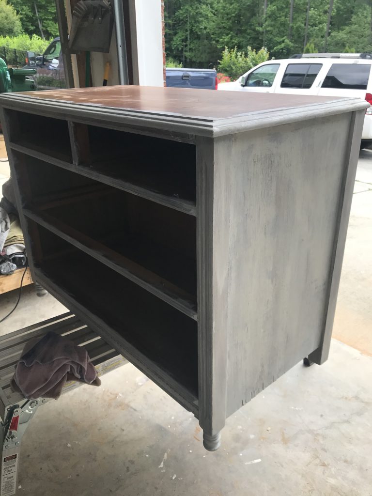 The drawers were coated in a thick layer of polyurethane, so I had to sand them down to make sure that I didn’t have an adhesion problem with the paint. I also sanded down the top because there were several dents and scratches. Once I started sanding, I noticed that the drawer fronts were in good shape and had a cool grain. Change of plans! I decided not to paint them and instead to sand them down to bare wood, and then do a wash of the Raw Silk. As you can see, the top drawers have a different type, darker type of veneer. I hoped that I could do an extra layer or two of the wash to even that out and get them to match the other drawers.