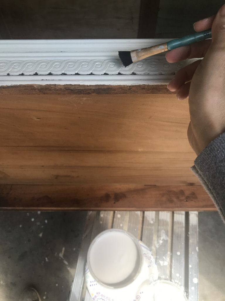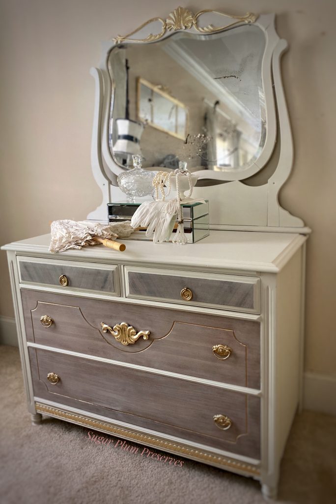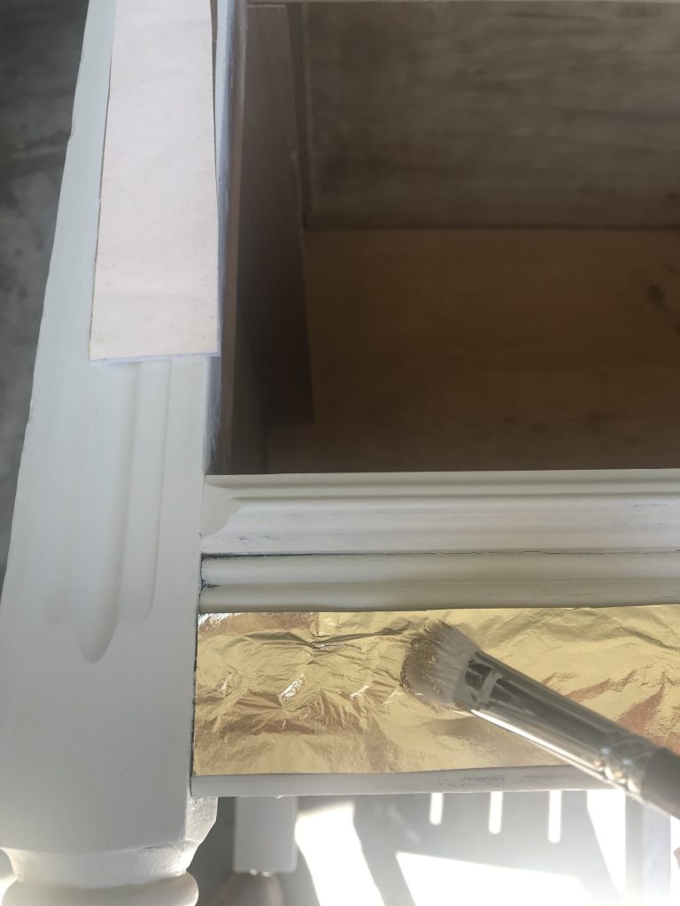 I chose to use gold leaf to match the gold leaf mirror that I transformed for the second post in the series – Madeleine (https://sugarplumpreserves.com/2020/04/12/madeleine/). I applied gold leaf to the shell and scroll work on the mirror, the shell on the drawer, and the detail on the bottom of the dresser. To apply gold leaf, you must first apply the sizing (adhesive). Use a crafters brush that you will designate for this purpose, as you won’t be able to get it “unsticky” after you use it for this purpose. The sizing goes on white but dries clear. Once it is clear and tacky, you lay the gold leaf, tamping down with your finger or a soft natural bristle brush. The gold leaf will only stick to where the sizing was applied. Brush off the excess and buff it smooth. If you missed an area, just repeat the process until it is filled in how you like.