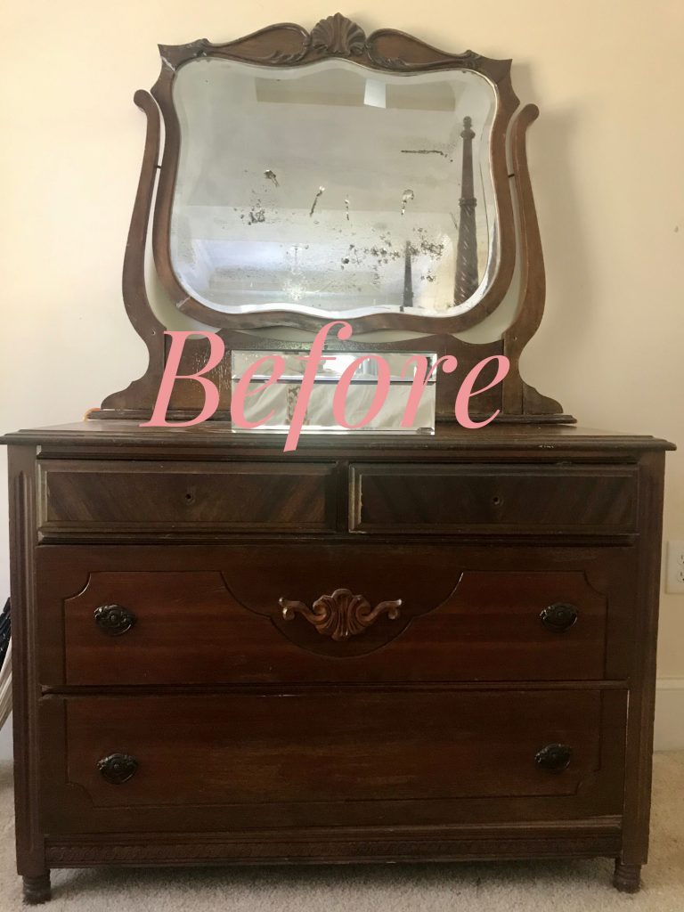 I have had this dresser for a few years. I got it for free in Boston and have had the intention of painting it for a few years, but you know how that goes.🙄 The mirror did not come with it, my friend (who is also a picker) found it on the side of the road waiting for the trash. It was in a few pieces and she eventually decided that she didn’t want to spend the time to fix it and asked me if I wanted it. The shell detail matched my dresser, I liked how the mirror was aged and losing some of the silvering (plus, it was in need of a home! What was I to do??), so I said sure! I was moving from Boston to North Carolina at that time, so I did a quick stitch together with liquid nails to keep it in one piece until I got there……..Annnnnd it sat like that on top of my unfinished dresser up until NOW! Read on to see how I turned these mismatched give aways into one beautiful piece of furniture.