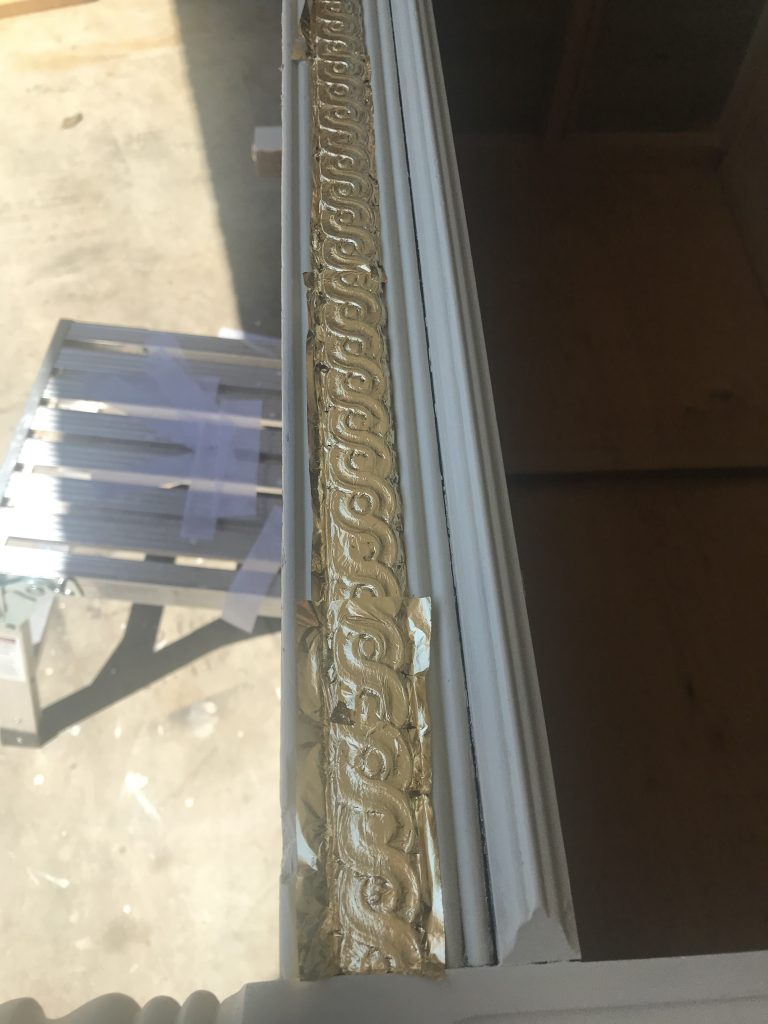 I used a gold paint pen to bring out the accents on the bottom drawers. As you can see, I painted the shell detail in Raw Silk. I thought maybe I would add gold rub n buff on the shell detail on the drawers and mirror to match the gold rub n buff scroll detail on the settee, Chou A La Creme (https://sugarplumpreserves.com/2020/04/26/chou-a-la-creme/) However, I am a “figure it out as I go along” type of person and after I added the gold rub n buff to the shell on the mirror, it wasn’t glamorous enough. I knew they had to be gold leafed too! AMIRIGHT?!? 🙋🏻♀️